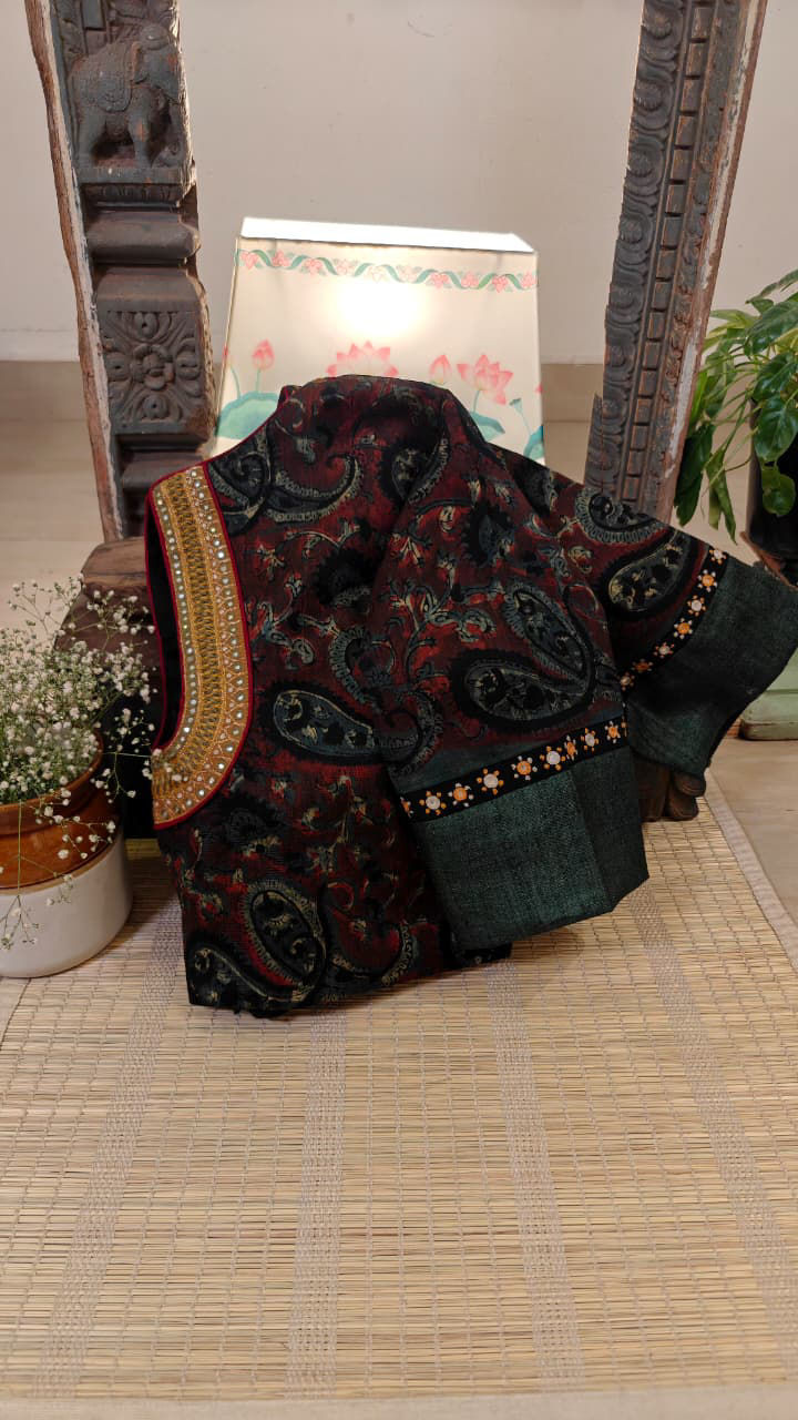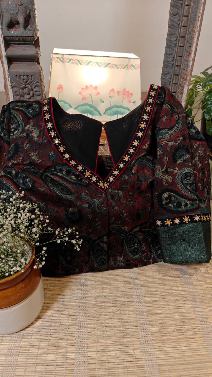 Hand block printed on Chanderi, brought alive with vintage embroidery. A blend of timeless craft and delicate detail, handmade at Svasa. 🌿πŸͺ‘