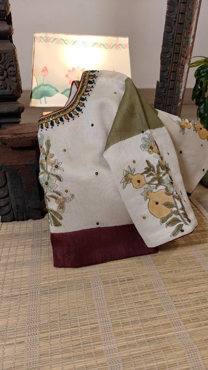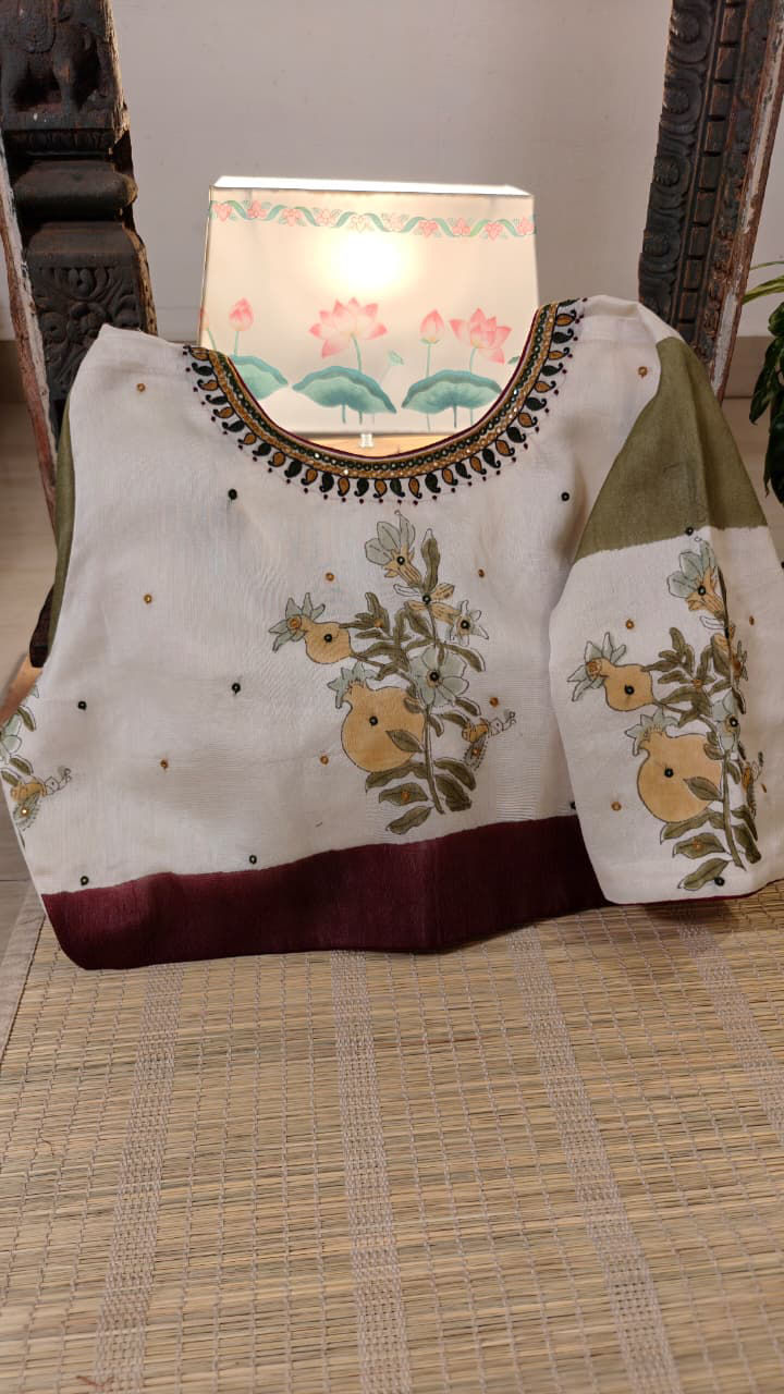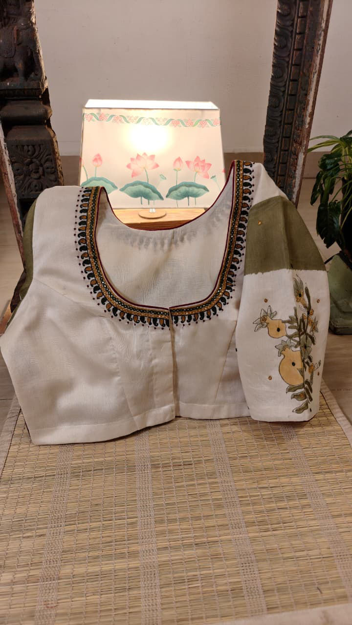 Our artisans creatively hand embroider, hand paint and hand print the blouses that come to you from the design house of SVASA. We use hand woven fabric extensively. You may notice very minute, almost insignificant flaws in the crafts since they are all handmade. We urge our patrons to overlook a few human errors that may have occurred in the process. Our aspirations are towards an empowered society, focusing on keeping traditional needlecraft alive for a long time to come.