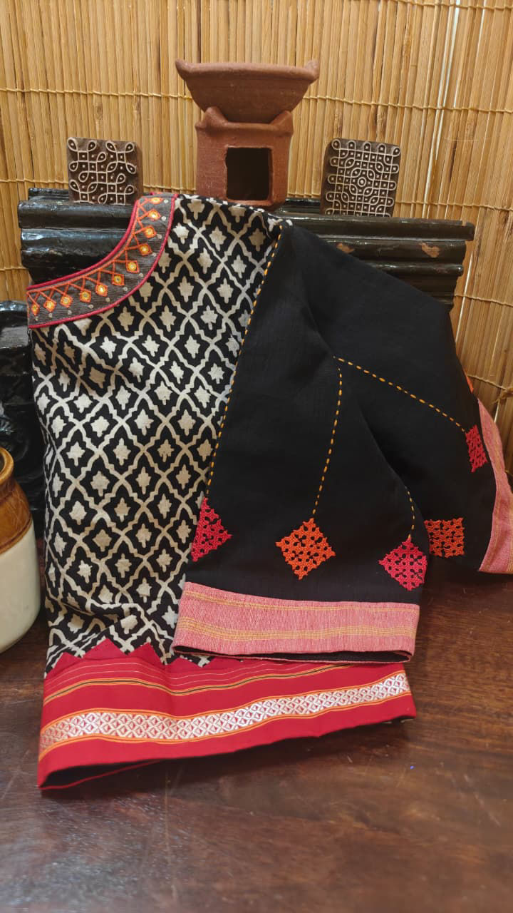 Block printed in black and ivory, held together with plain charcoal sleeves that bring a sense of calm depth. Kutchi embroidery adds just the right note of texture—earthy, detailed, and quietly striking. A piece that settles into you… understated, yet full of character.
