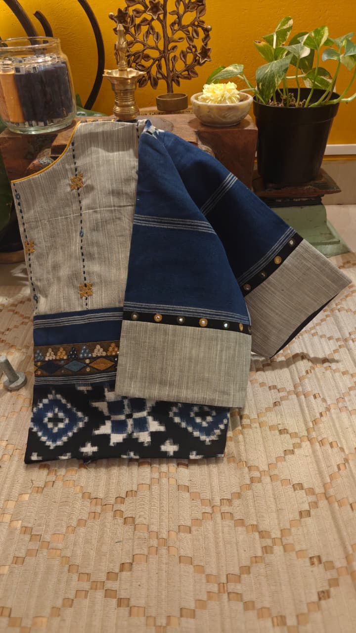 A deep-toned Telia Rumal in charcoal and blue with an ashy undertone, brought to life with vibrant embroidery in a medley of colors. Crafted in cotton, the piece holds a beautiful contrast—muted depth meeting expressive detail. Rooted, bold, and quietly striking, it carries a strong craft presence