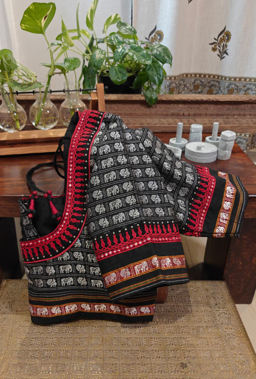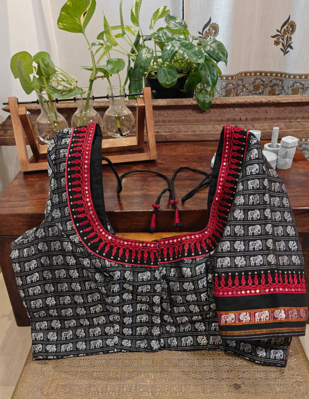 A stunning Khun cotton blouse in charcoal and ivory, brought to life with chilli red embroidery. Earthy tones, bold details—woven tradition with a modern edge.