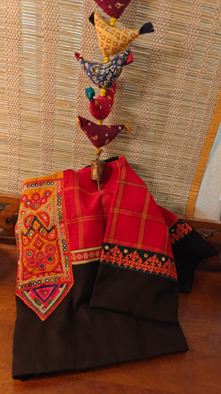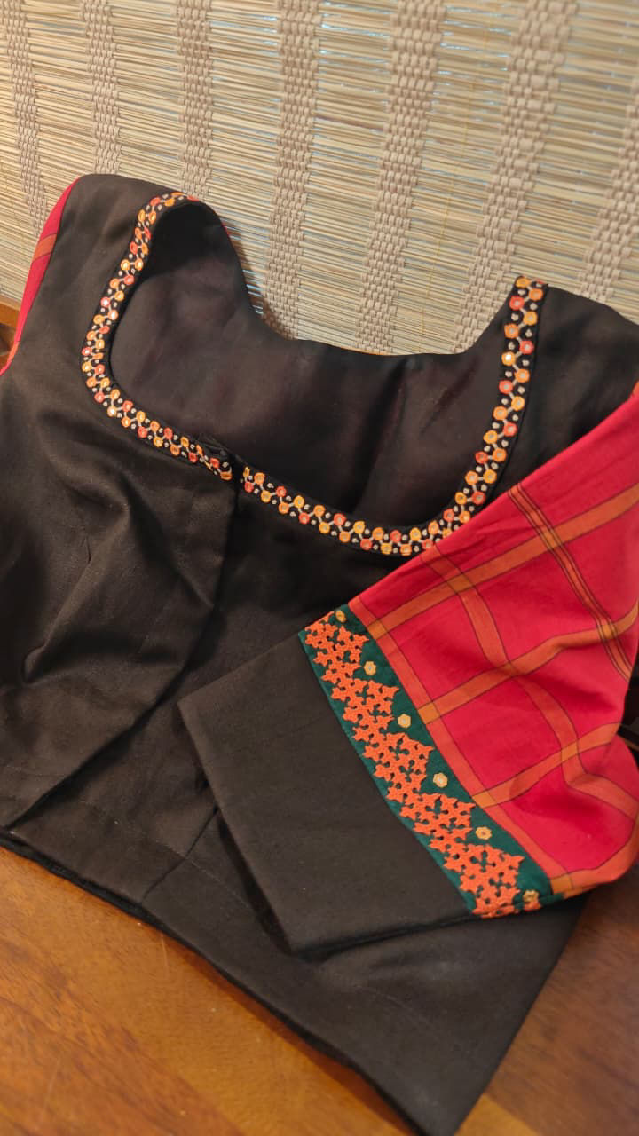 Classic Kandangi checks in bold charcoal and red, brought to life with colourful folk embroidery. Handmade in cotton, this one carries that perfect mix of tradition and everyday charm — easy to wear, hard to miss. Svasa original. Limited pieces.