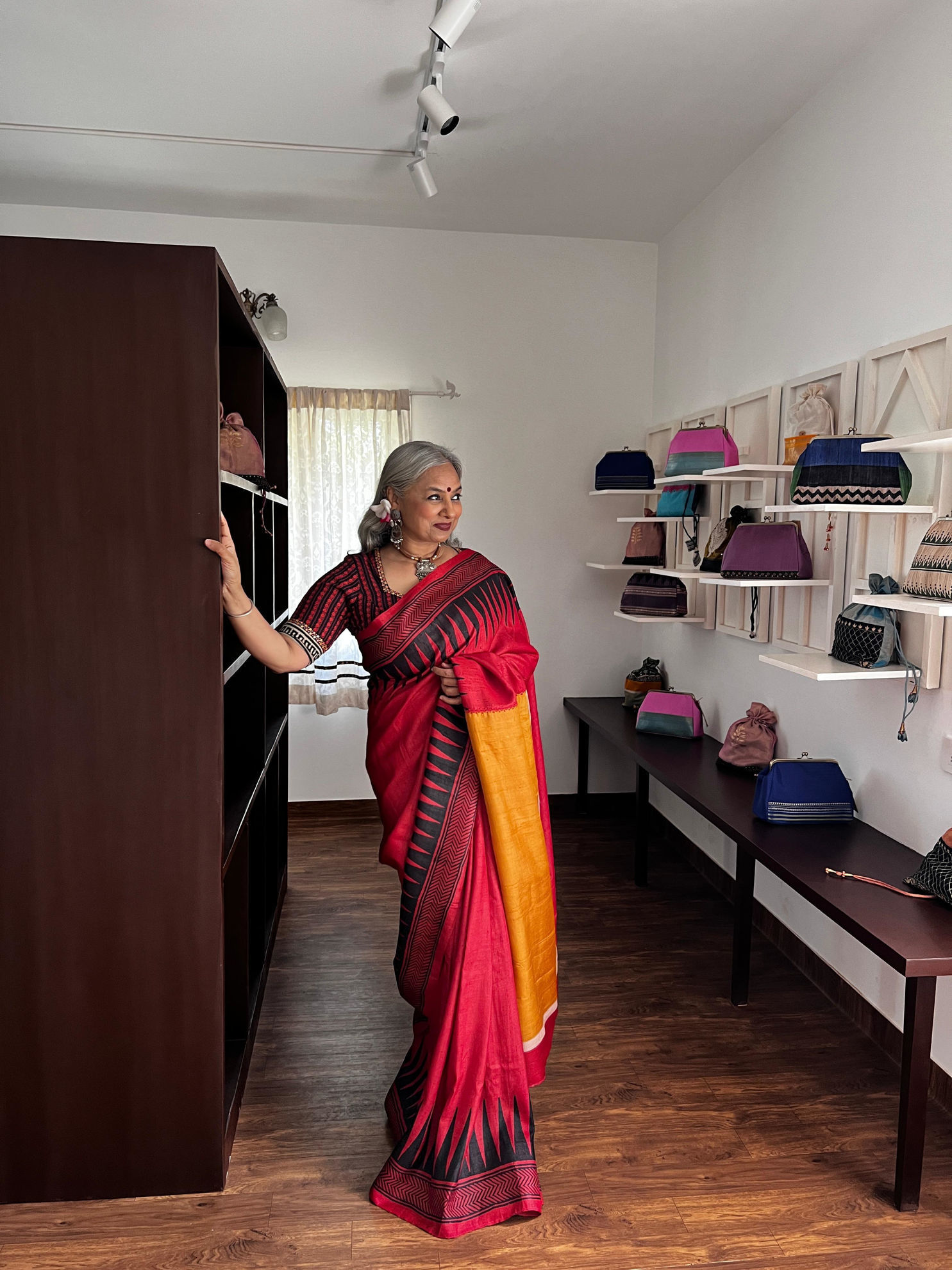 A gorgeous chilli red tussar silk, brought alive with geometric block printed borders and a striking pallu that adds depth and rhythm to the drape. Teamed with a Kanchi cotton blouse adorned with classic kolam motifs—grounded, detailed, and beautifully rooted in tradition. There’s a strong play of form and craft here… where bold color meets thoughtful detailing, coming together in a look that feels timeless and distinctly Svasa. Please note: The cost of the blouse is not included in the saree.