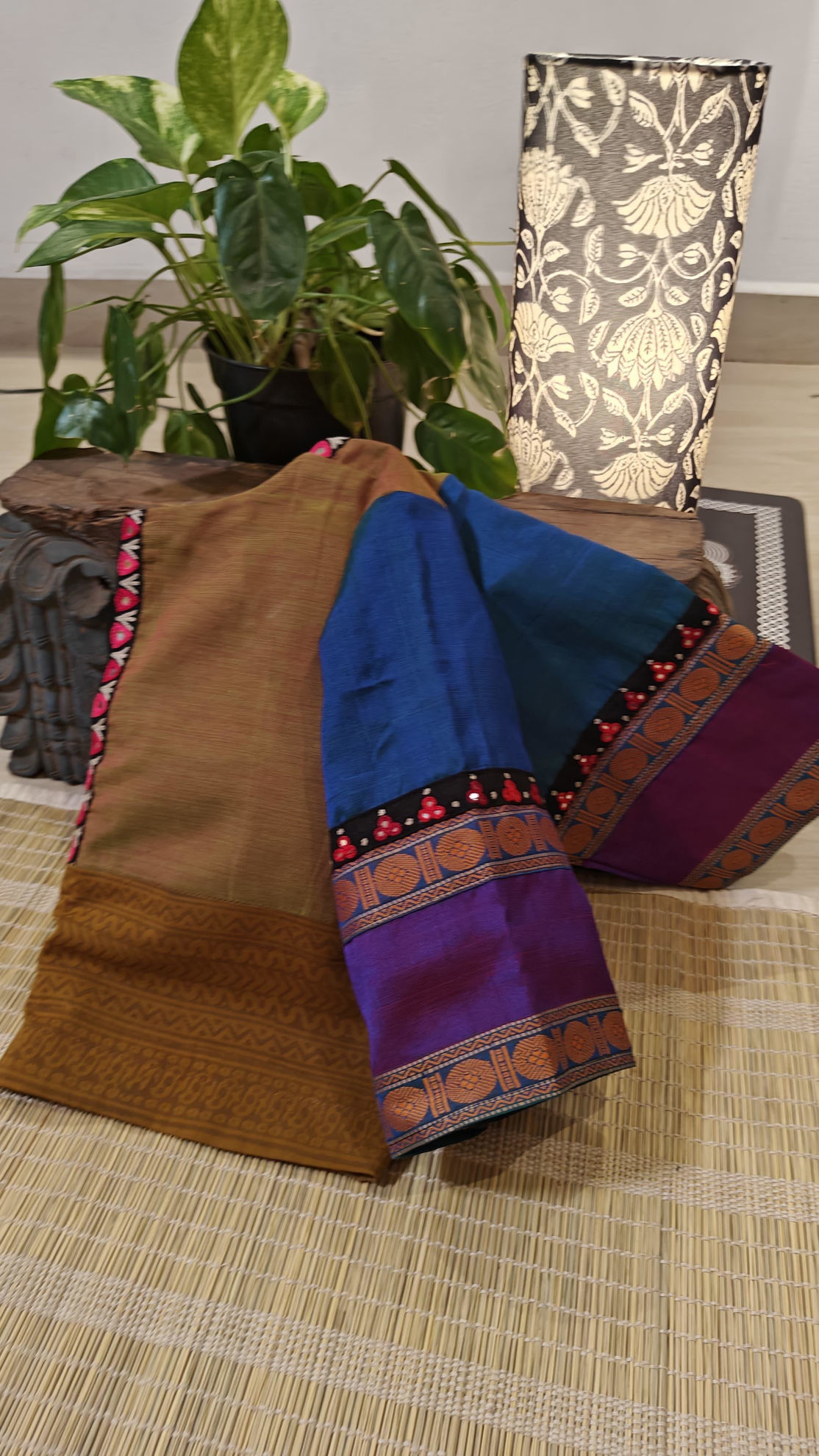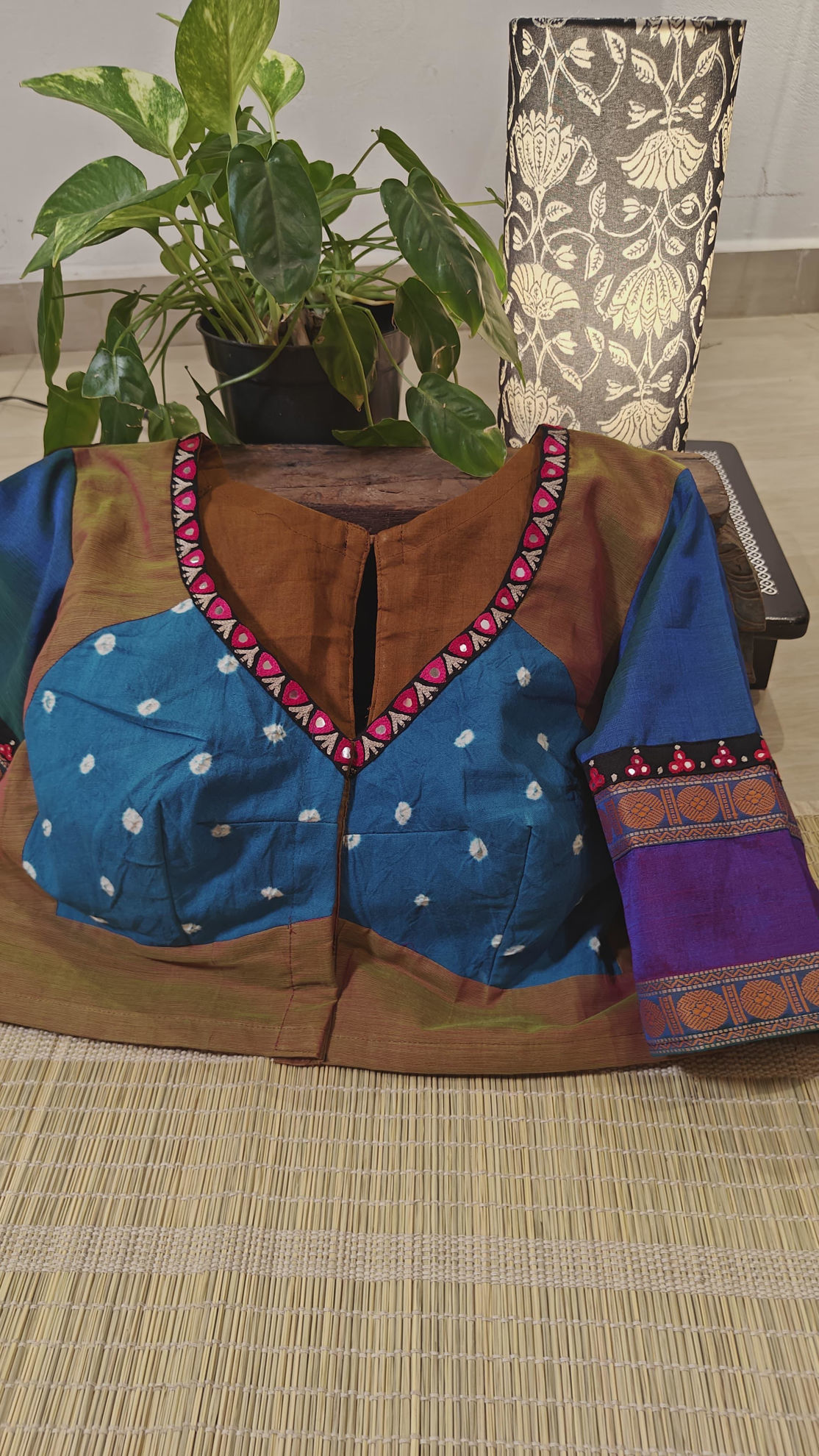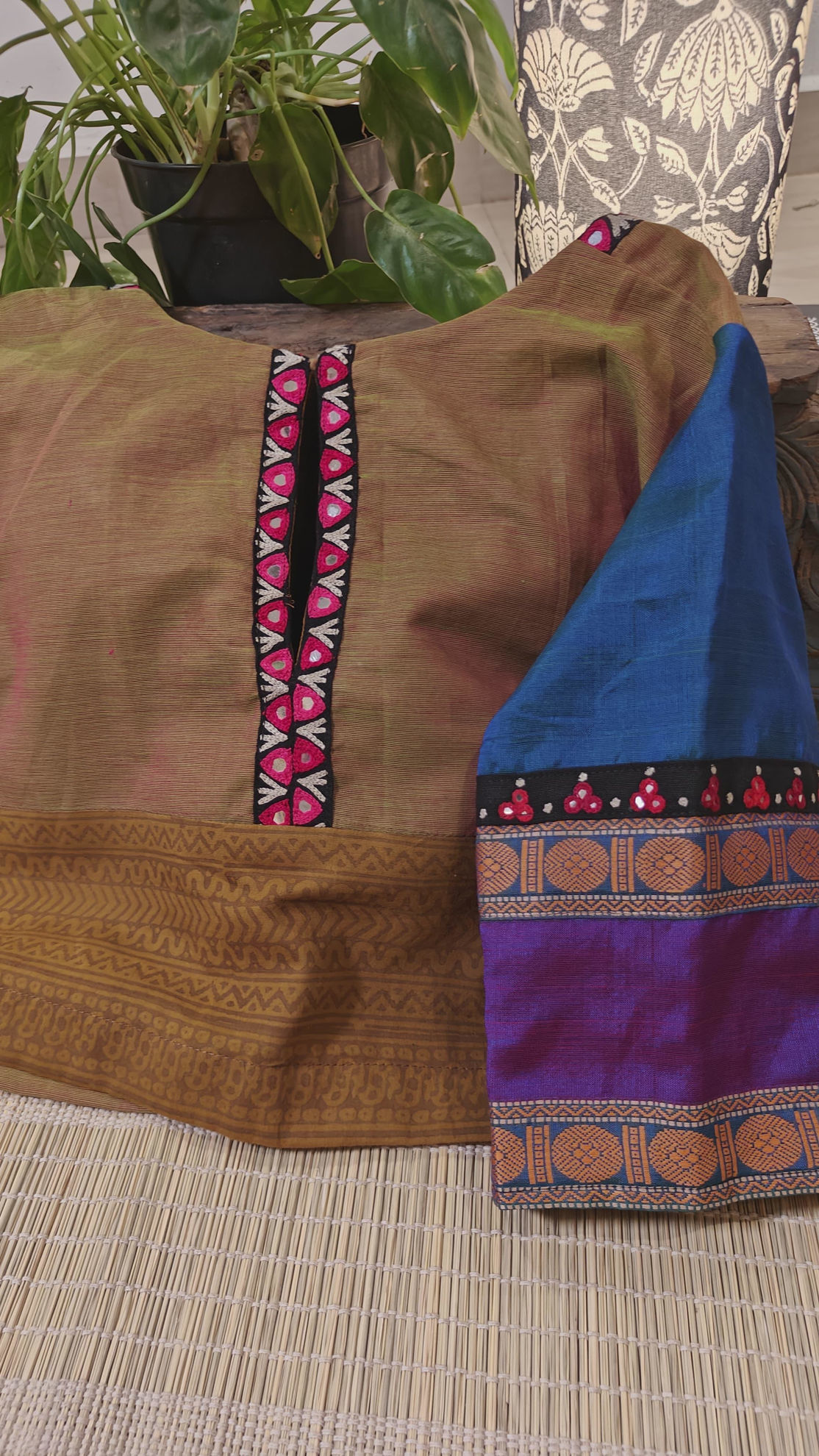 A dull mustard body meets a vibrant blue bandhani — bold and beautiful. The sleeves? Woven in traditional vadamalli borders, deep and rich. All brought together in a katori cut, where contrast carves the spotlight ✂️ A medley of weaves and threads, stitched for those who dare to be different.
