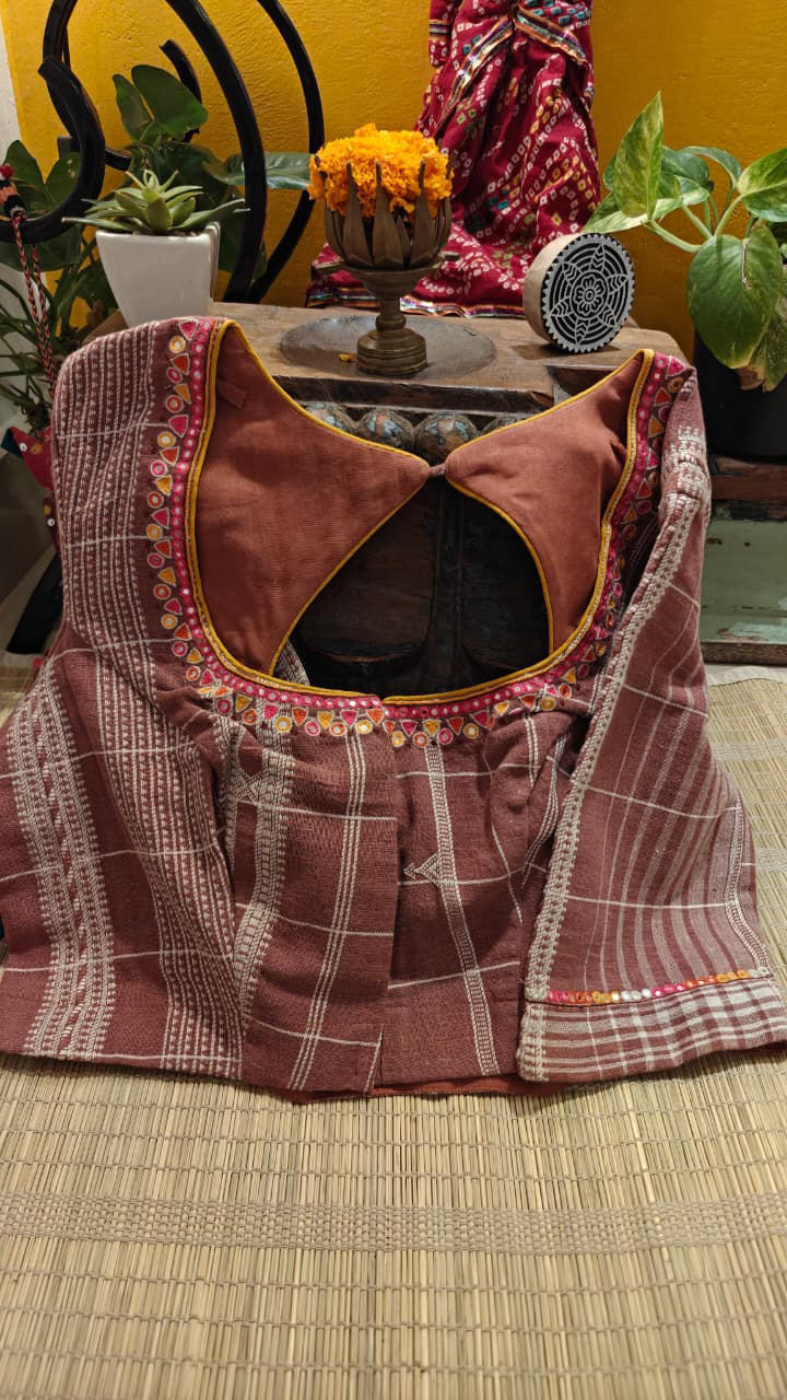 A warm cinnamon Bhujodi, rich in tone and texture, brought to life with bold tribal embroidery. The weave carries its rustic soul, while every stitch adds depth and character—unfiltered, earthy, and true to its origins. A piece that feels grounded, yet quietly striking in its presence.
