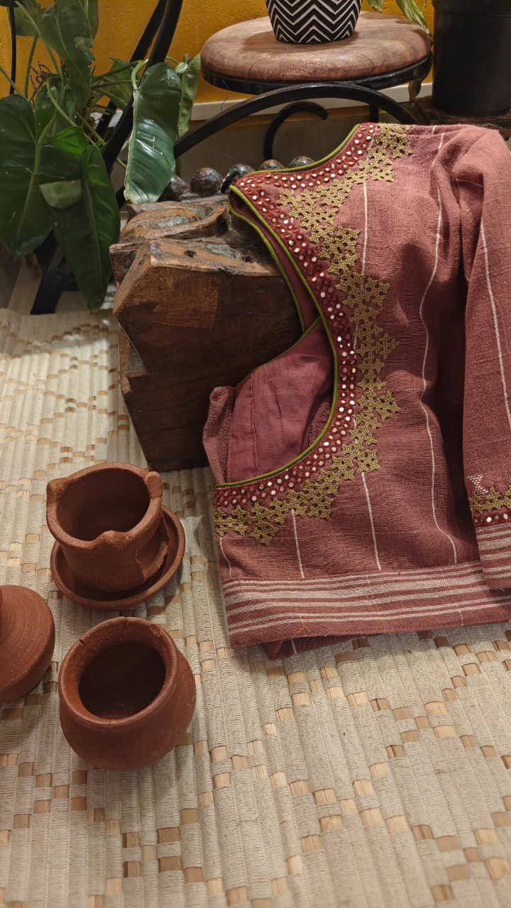 A warm cinnamon base in rustic Bhujodi weave, brought alive with thick Kutchi embroidery in deep olive green. Two rows of mirrors add a subtle gleam, catching light against the raw texture. Earthy, bold, and rooted in craft, this piece carries a striking tribal spirit with a timeless soul.