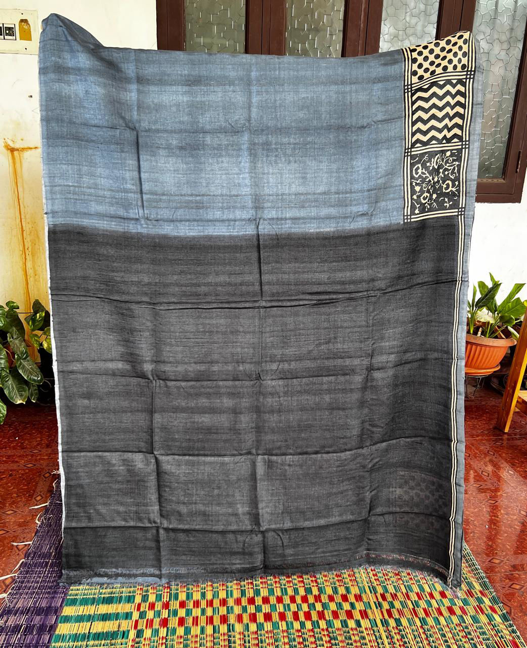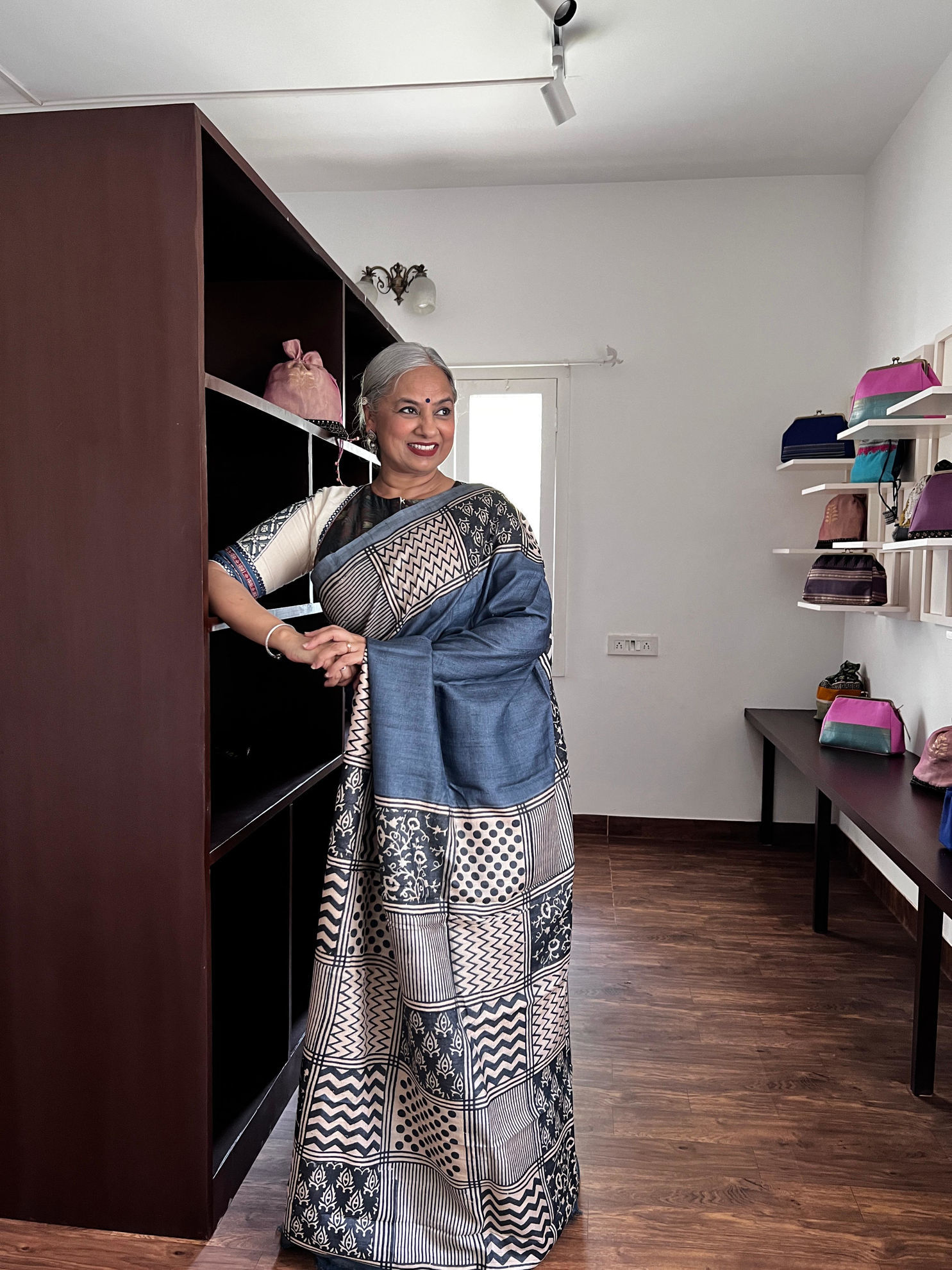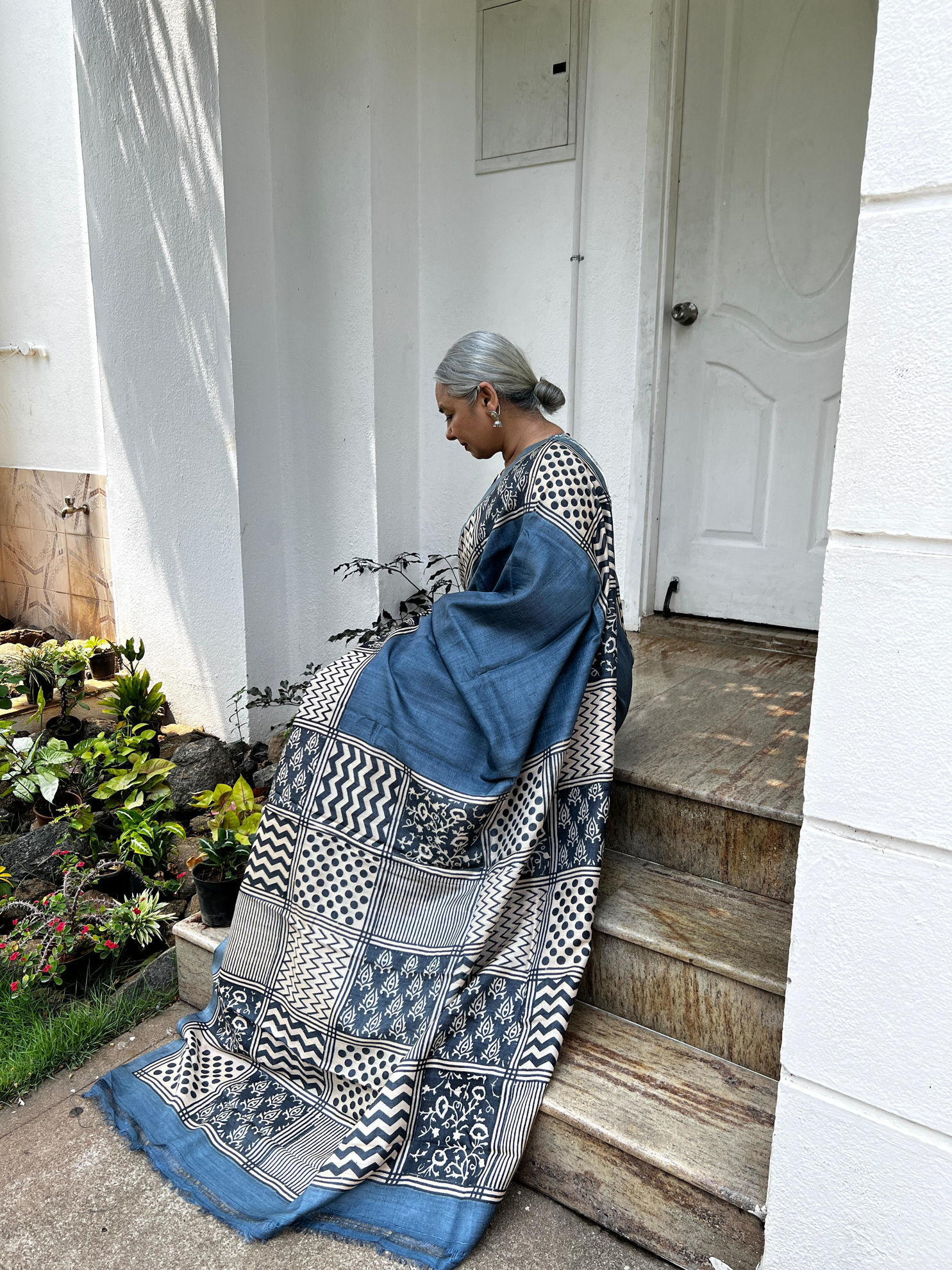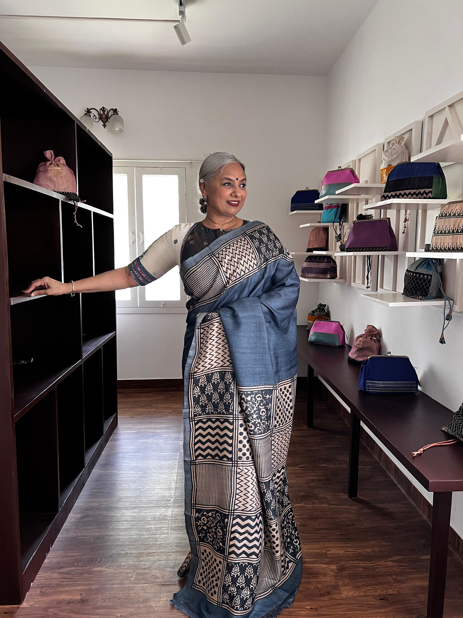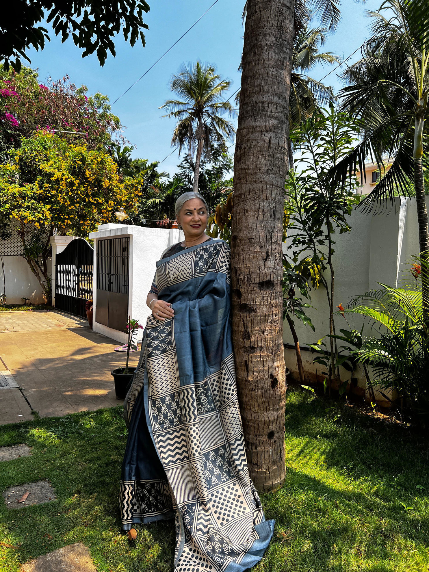 A timeless English blue grey tussar, brought alive with striking geometric block prints that play quietly yet confidently across the weave. There’s a certain stillness in this piece—rooted, composed, and unmistakably classic. Paired with our signature Bhopali yoke blouse, the ensemble finds its balance between structure and artistry, where every line and motif comes together with intent. Please note: The cost of the ready blouse is not included in the saree