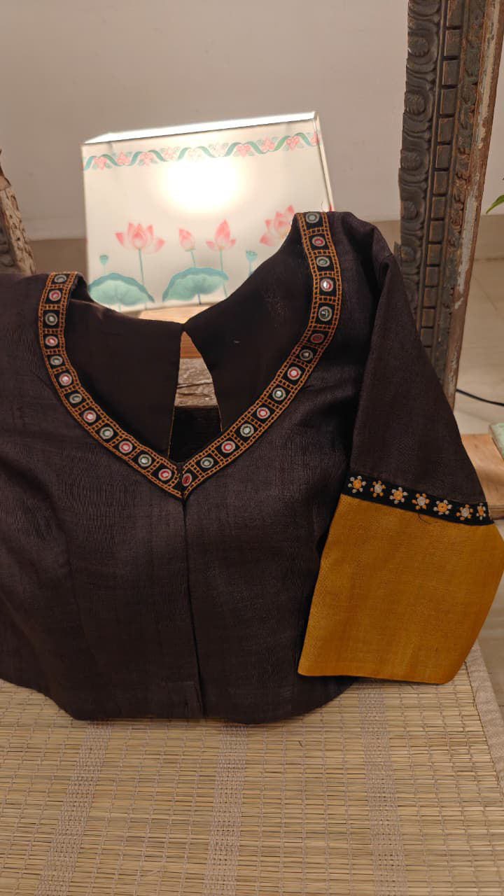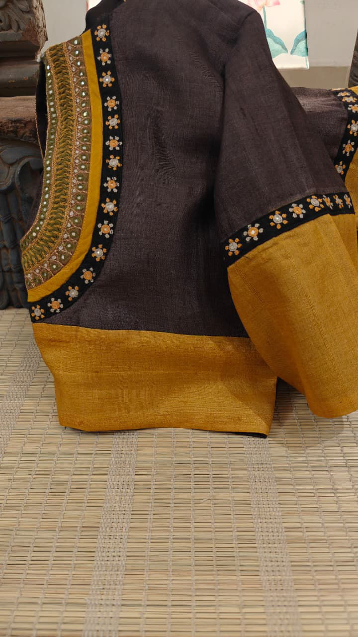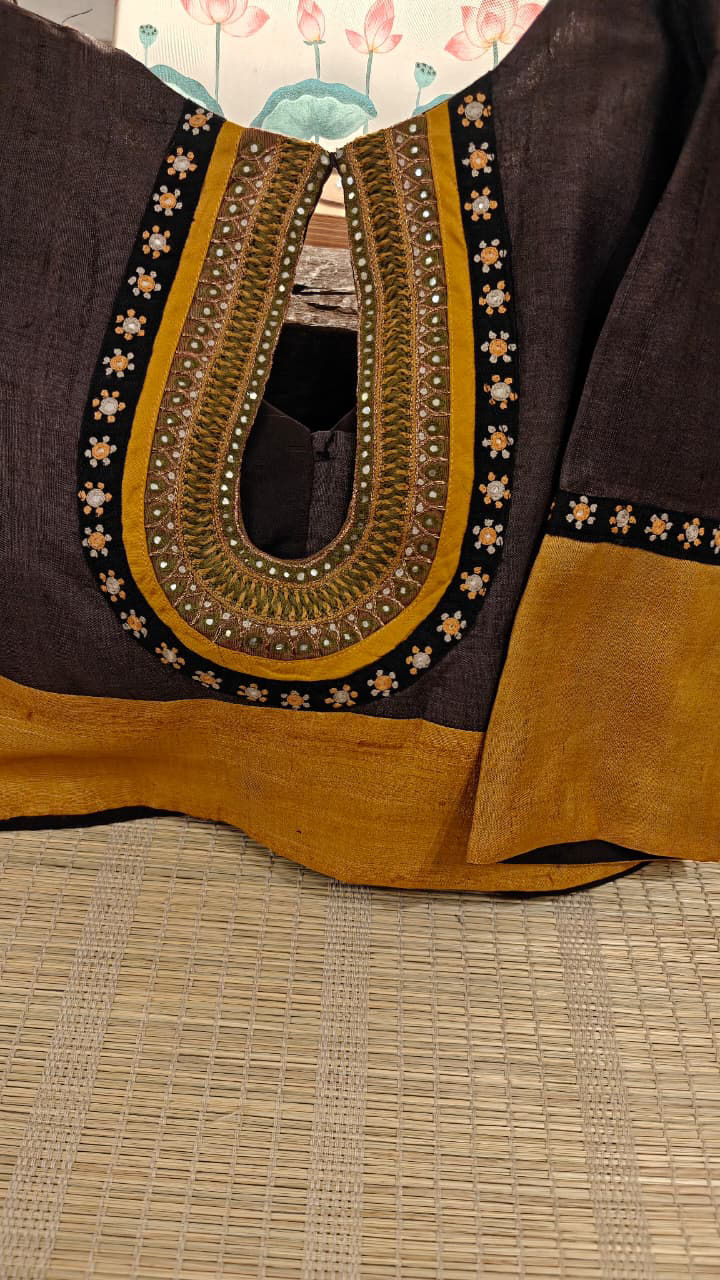 Pure tussar silk in coffee and ochre, brought alive with embroidery in vintage hues around the neck and sleeves. 🪡 An unusual mix of shades that makes this Svasa blouse truly timeless. 💛