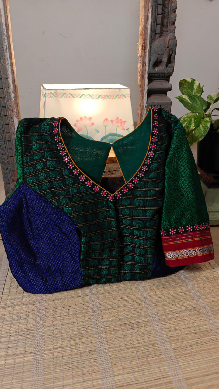 Our artisans creatively hand embroider, hand paint and hand print the blouses that come to you from the design house of SVASA. We use hand woven fabric extensively. You may notice very minute, almost insignificant flaws in the crafts since they are all handmade. We urge our patrons to overlook a few human errors that may have occurred in the process. Our aspirations are towards an empowered society, focusing on keeping traditional needlecraft alive for a long time to come.