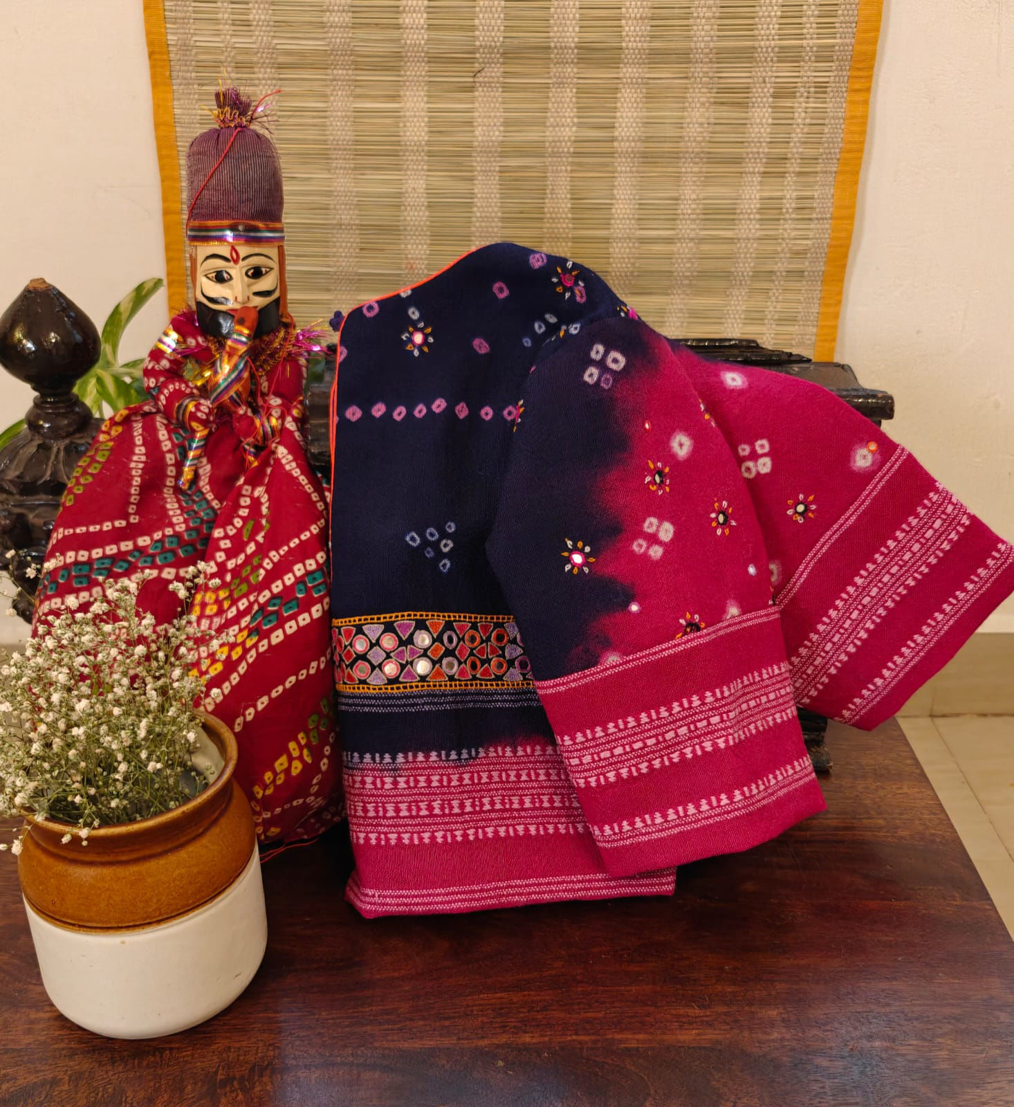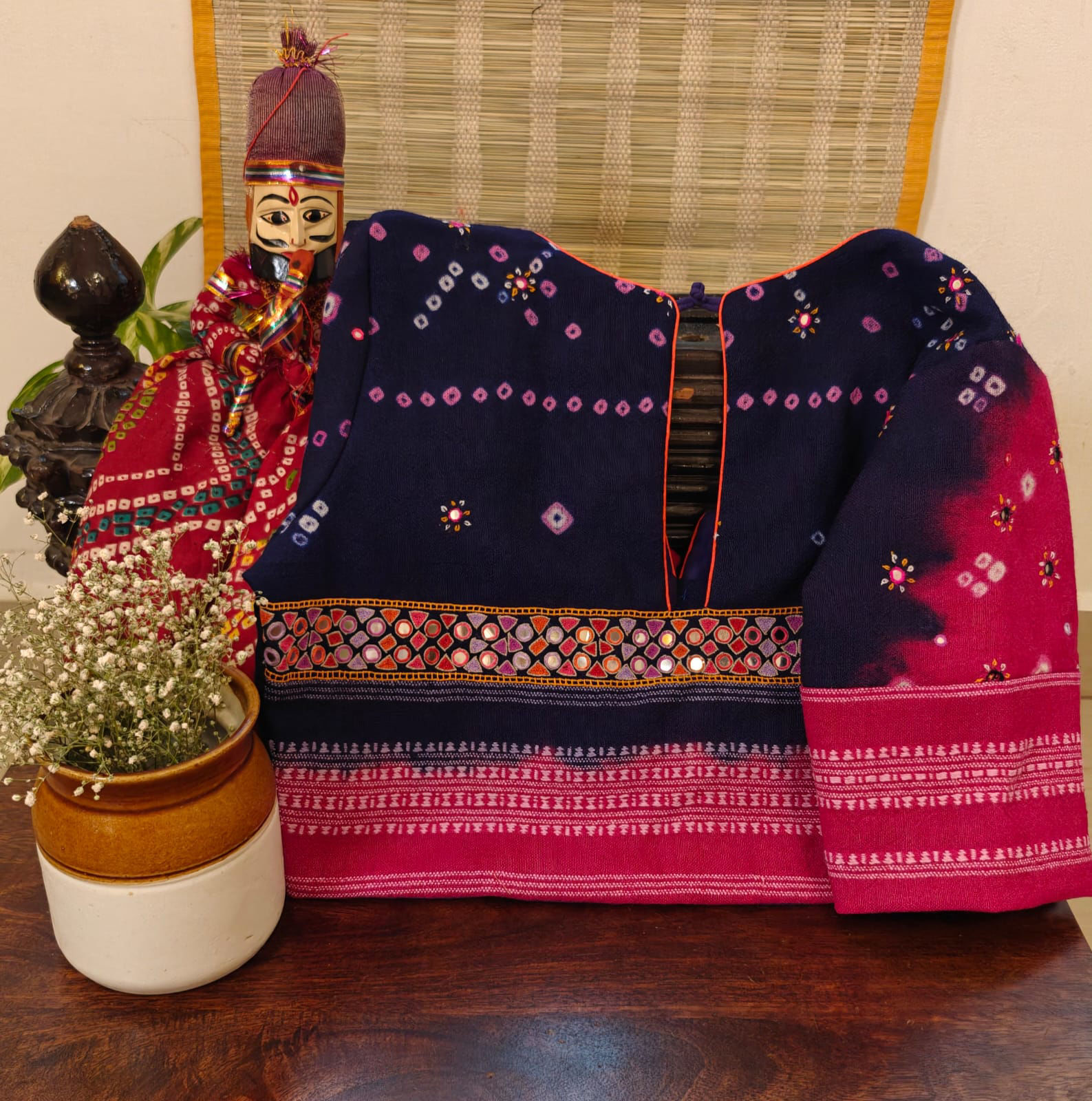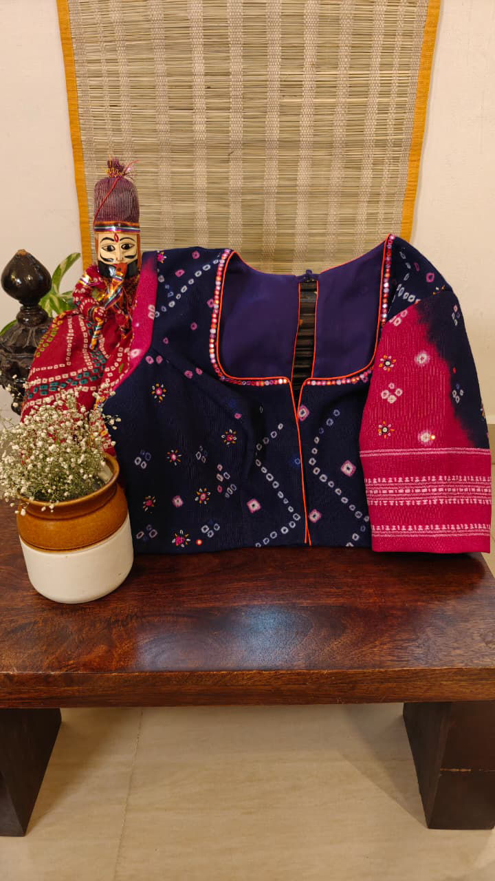 A deep and intense purple in bandhani — rich, saturated, and full of character. Handworked mirrors bring gentle sparks of light across the fabric, adding life without noise. Bold but not loud. Statement-making, yet familiar. A blouse that moves from day to evening with ease — quietly striking.