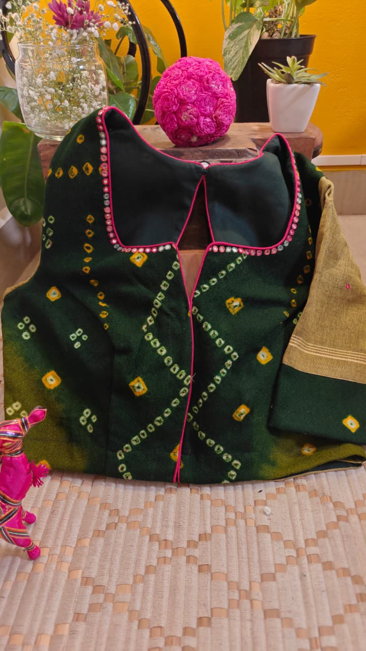 A celebration of color and craft. This green Bandhani comes alive with its rhythmic ties — each dot hand-bound, hand-dyed, carrying the pulse of tradition.