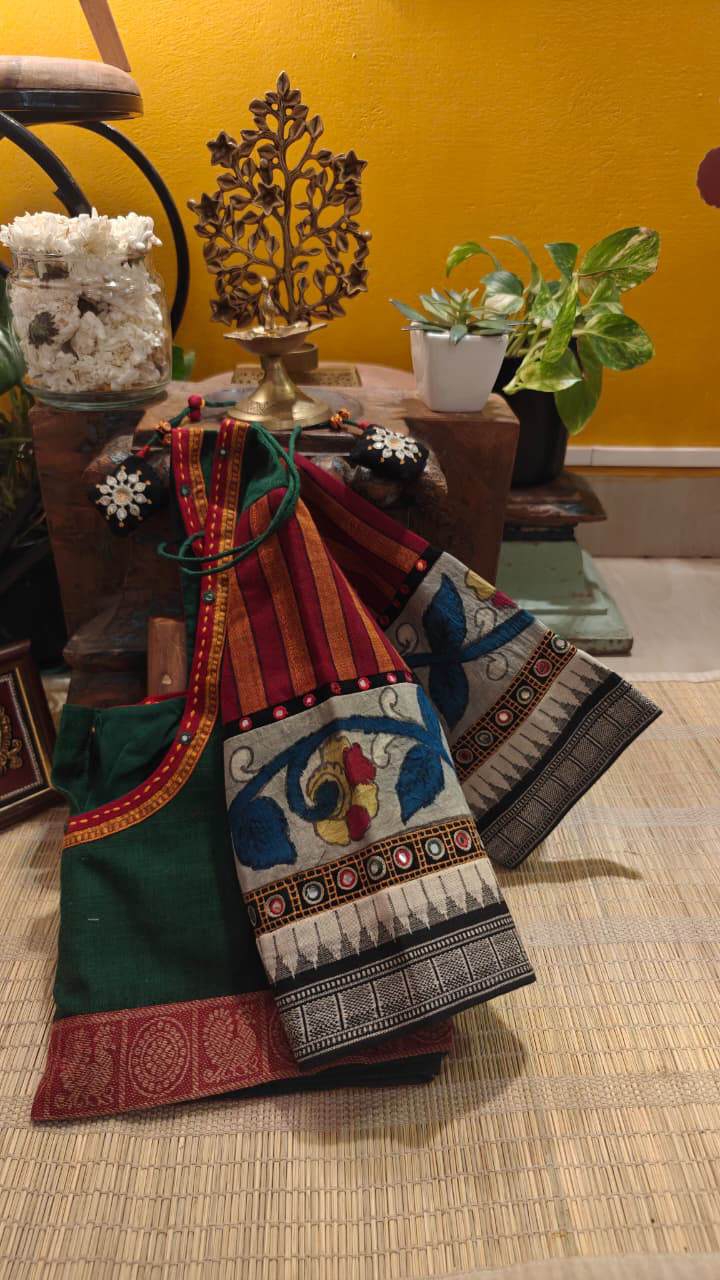 A rich emerald green brought alive with intricate Kalamkari, woven together with a thoughtful fusion of weaves. Layers of texture and craft come together in quiet harmony—distinct, rooted, and full of character.