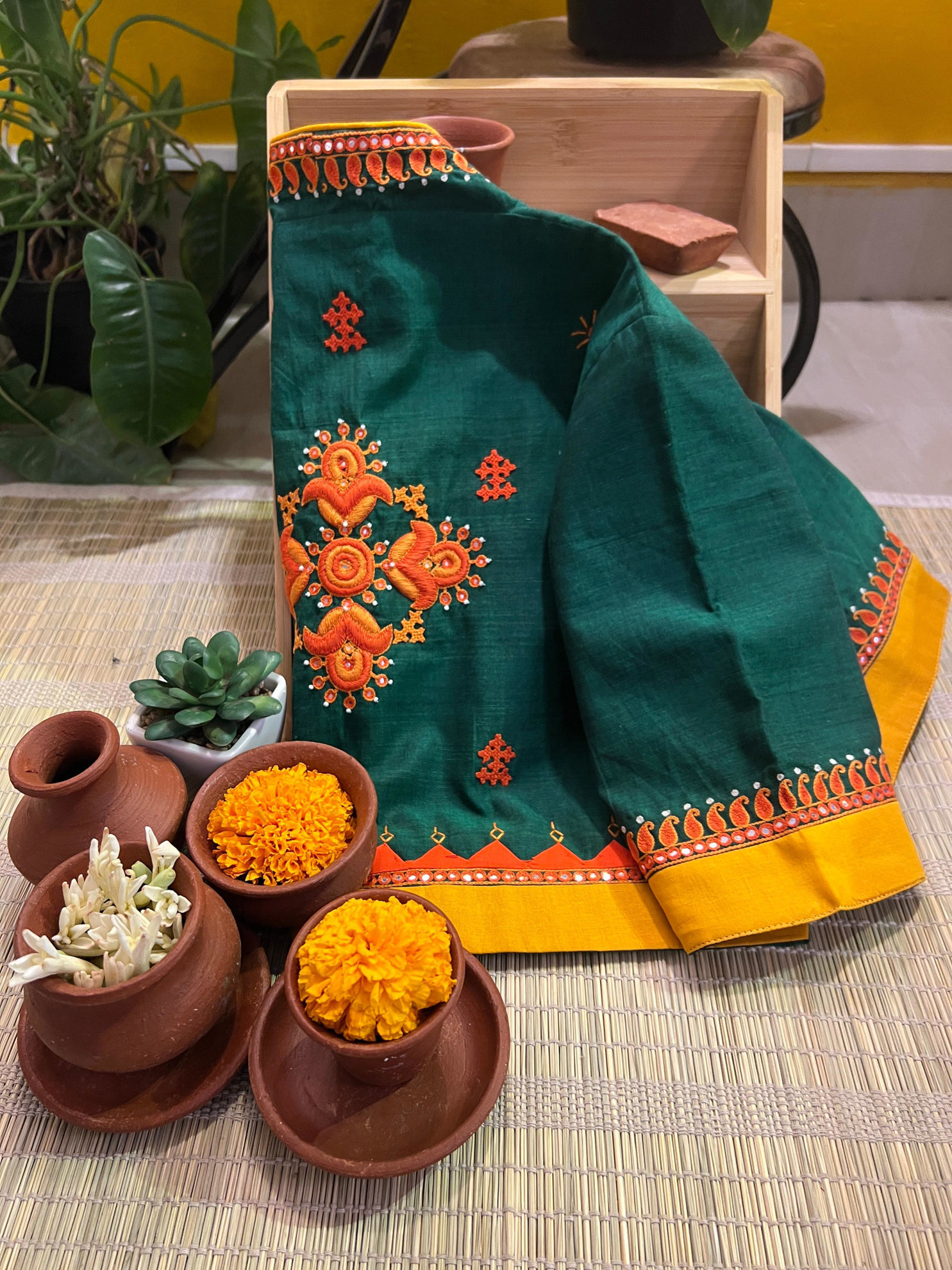 Emerald green never fails—and when paired with our mutka neck, it’s a classic that always stays in style. Embroidered in vibrant shades of orange and yellow, this beauty is a timeless piece for every saree lover! A signature Svasa design that’s here to stay❤️🍁