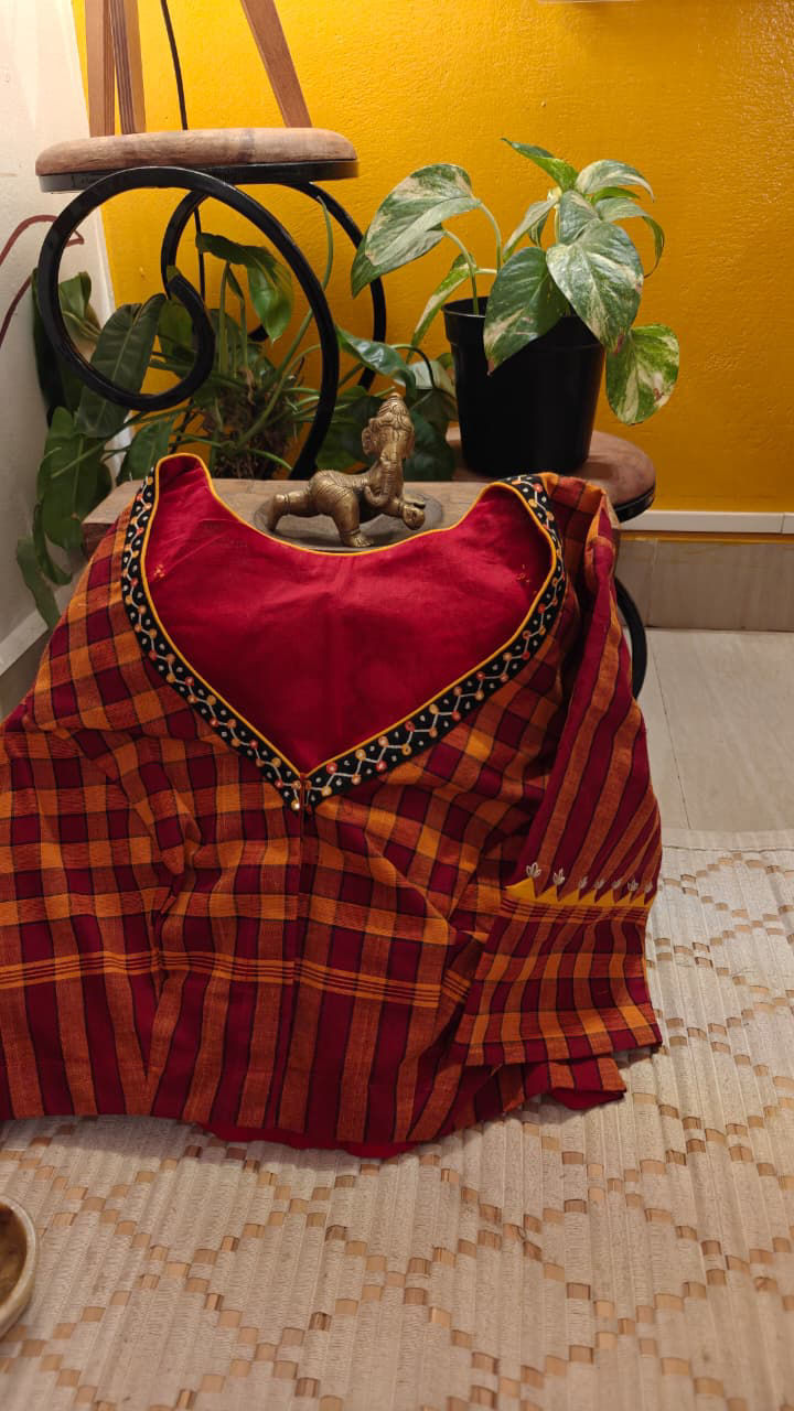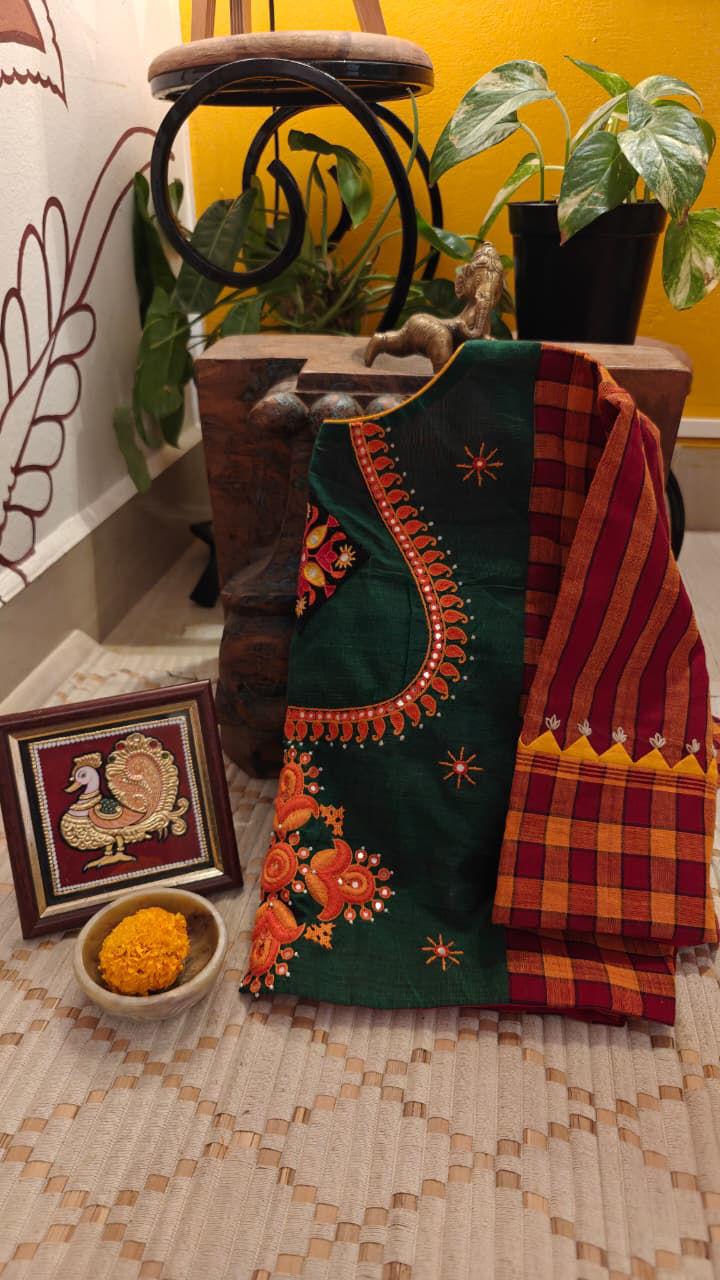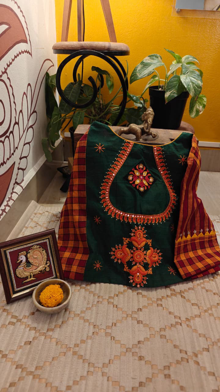 Rooted in the heritage of Karaikudi and inspired by the timeless charm of Chettinad, this Kandangi checks blouse carries tradition in every bold line. An emerald green yoke anchors the vibrance, creating a striking contrast against the classic checks. Paisleys in sunlit orange and radiant yellow bloom across the fabric, while a thoughtfully placed central motif draws the eye — like a story held close to the heart.