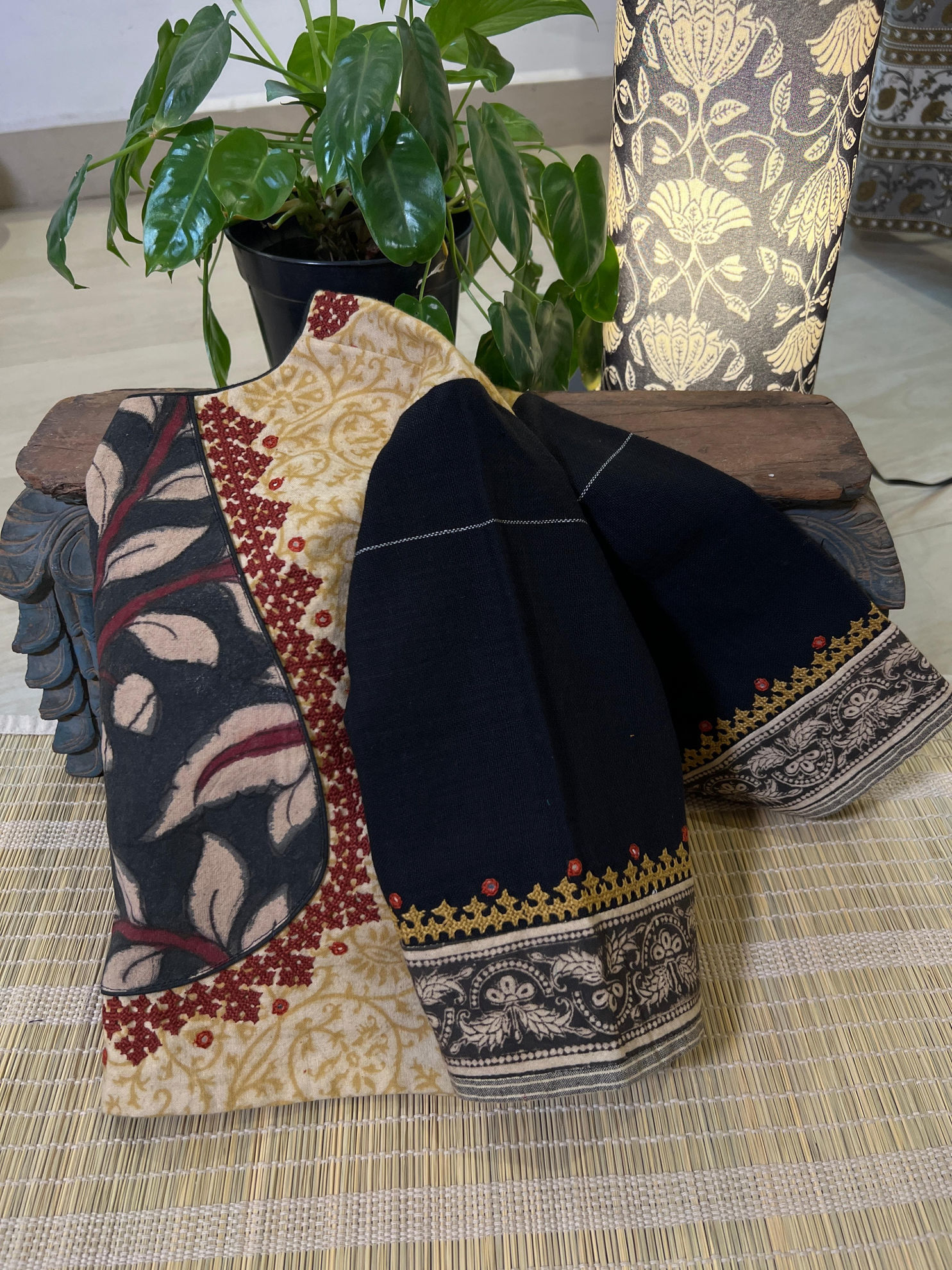 A cool fenugreek-hued block printed cotton blouse — subtle, earthy, and beautifully grounded. The highlight? A striking black and ivory Kalamkari yoke in a classic mutka cut, richly bordered with thick rust-hued Kutch embroidery. A celebration of craft, contrast, and conscious style. Made for the everyday you — handcrafted, wearable, and one of a kind.