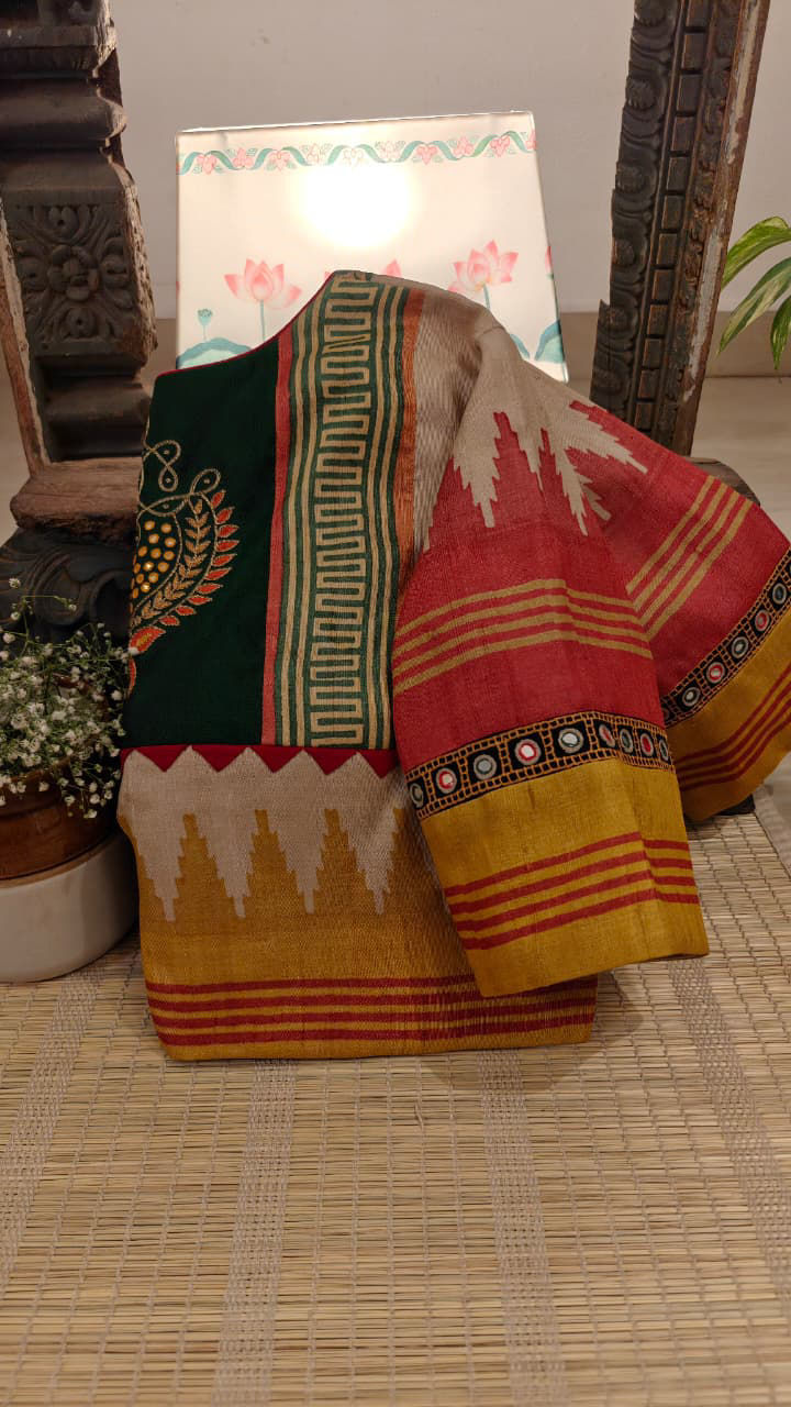 Tussar silk in a classic Ganga Jamuna layout on a soft sandal base, paired with borders in red, orange, and yellow. A green yoke embroidered with kolam motifs completes this beautiful fusion of colours, craft, and culture — unmistakably Svasa.