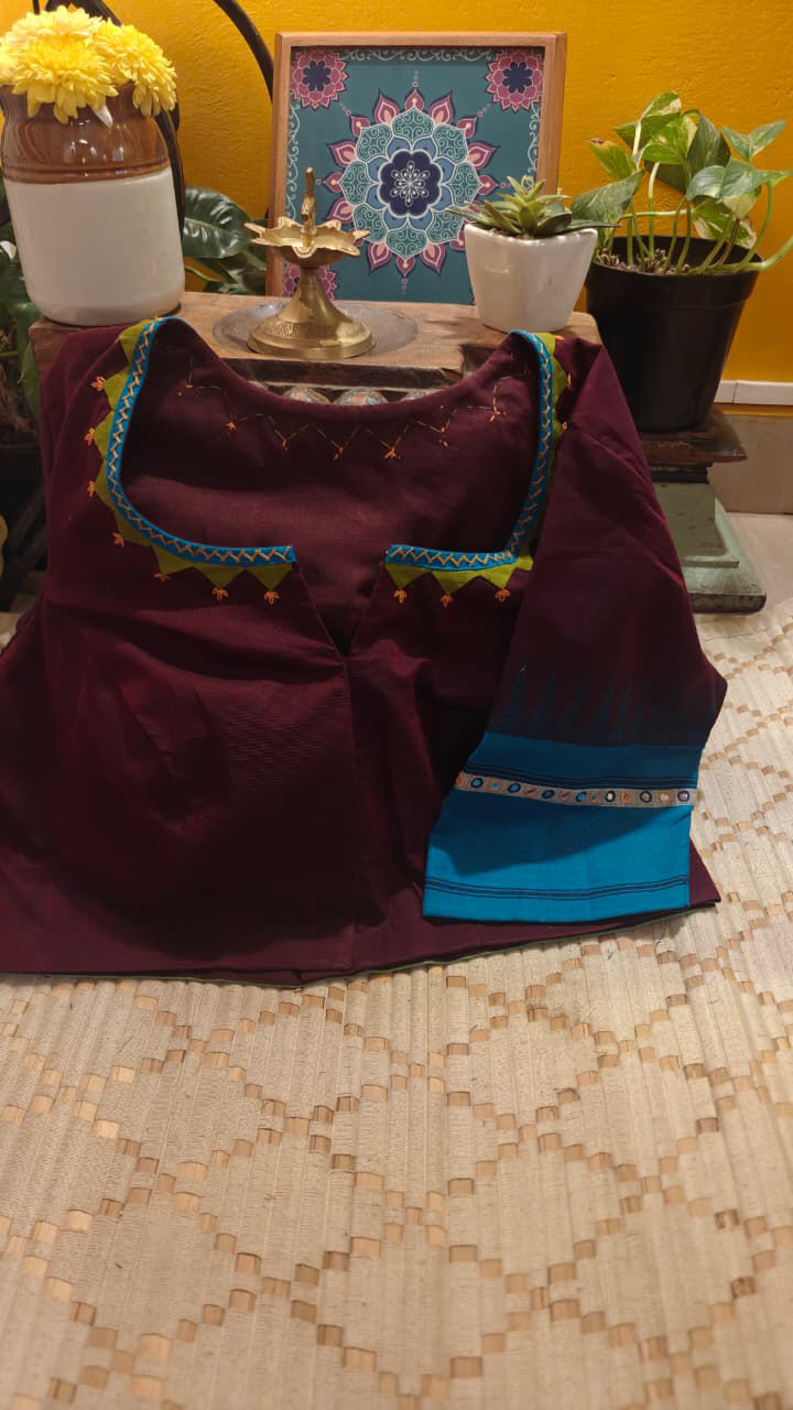 Our artisans creatively hand embroider, hand paint and hand print the blouses that come to you from the design house of SVASA. We use hand woven fabric extensively. You may notice very minute, almost insignificant flaws in the crafts since they are all handmade. We urge our patrons to overlook a few human errors that may have occurred in the process. Our aspirations are towards an empowered society, focusing on keeping traditional needlecraft alive for a long time to come.