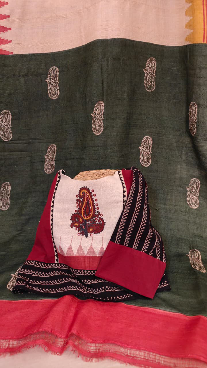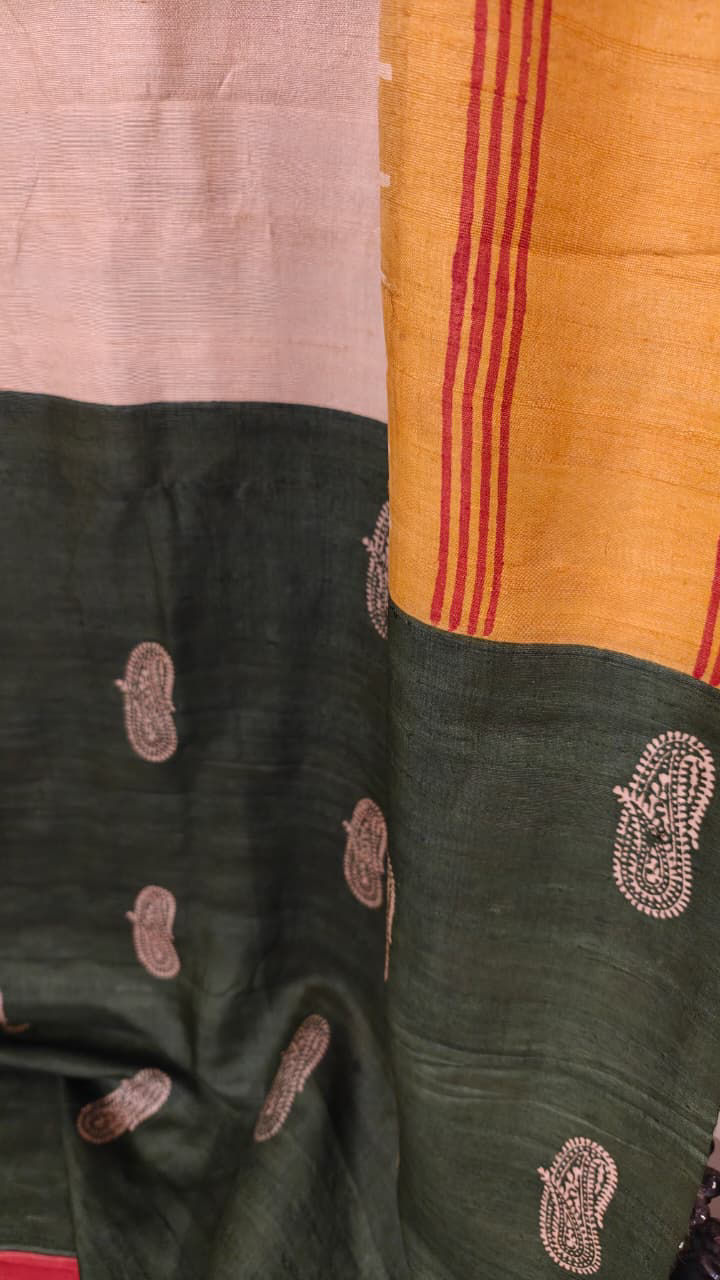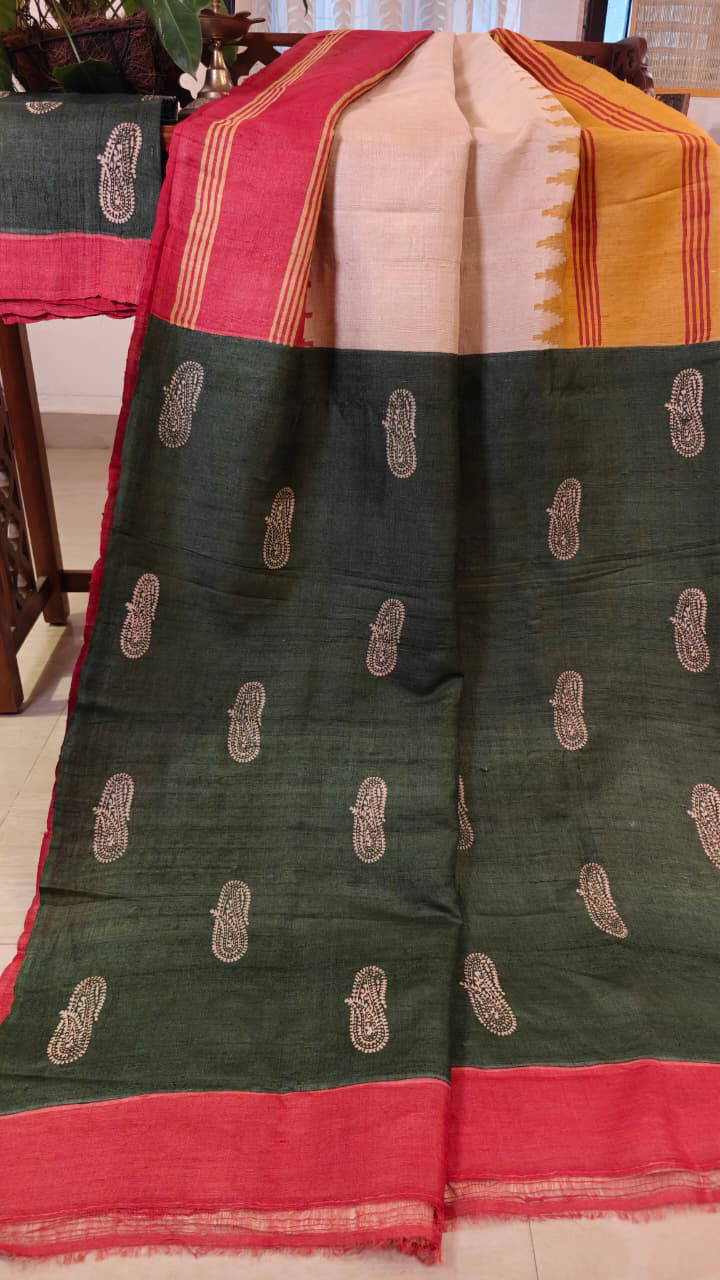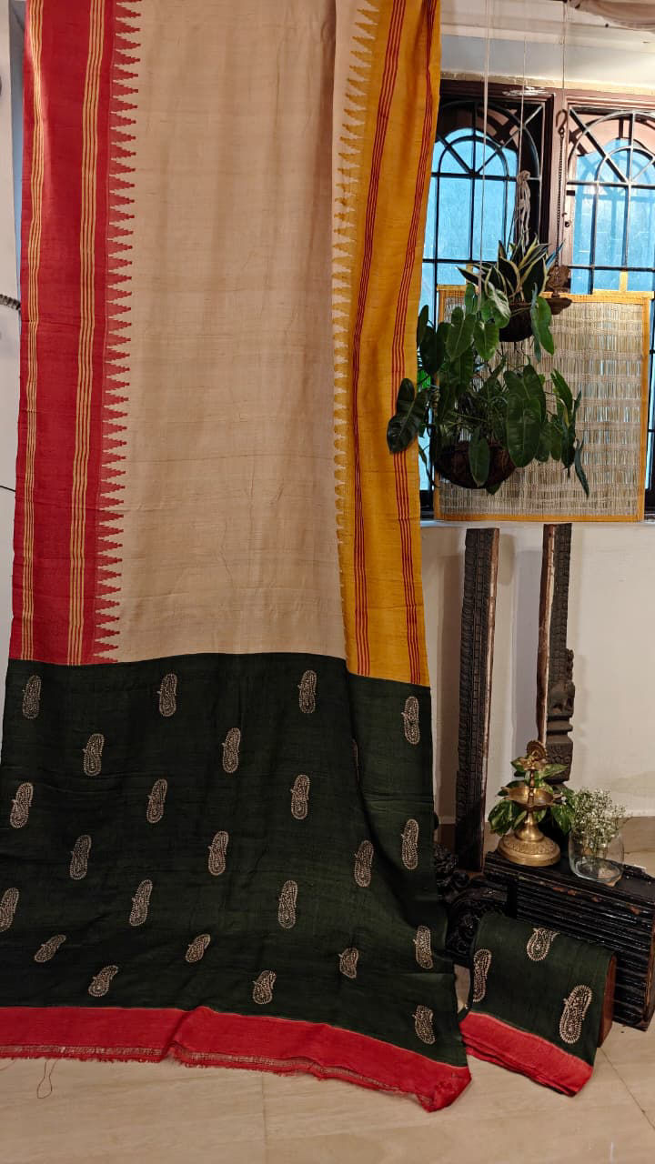 An ivory Tussar brought alive with classic Ganga Jamuna borders in red and yellow. The forest green pallu unfolds with ivory paisleys, adding depth and contrast, while a thoughtfully matched blouse completes this unusual yet beautifully balanced saree–blouse combination. Rooted, striking, and distinctly Svasa.