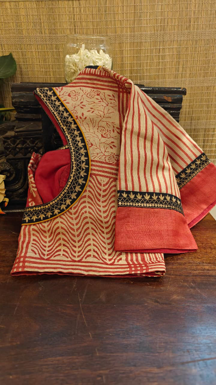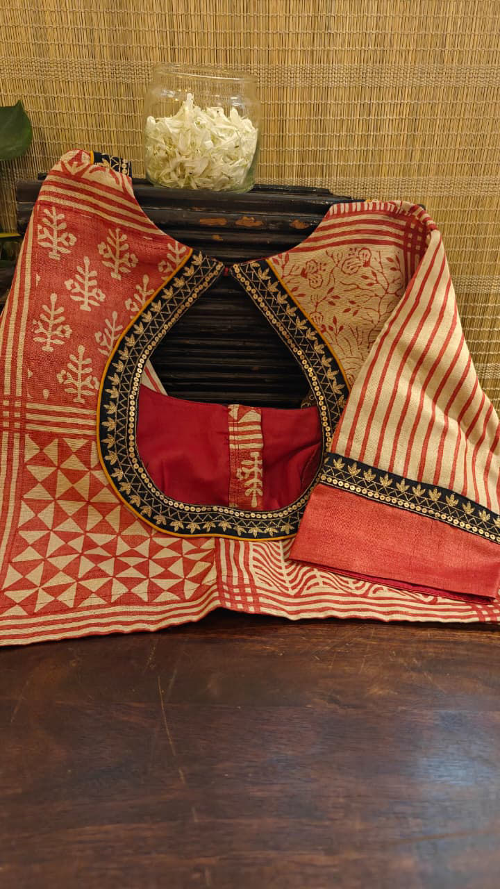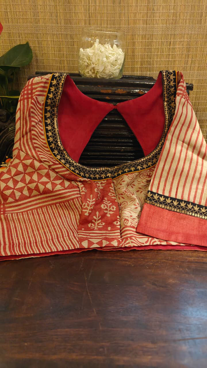 Tussar silk brought alive with geometric block prints, layered with antique gold embroidery that catches the light in the most subtle way. A play of structure and texture—where every line is deliberate, every detail quietly striking. Rooted, refined, and unmistakably Svasa.