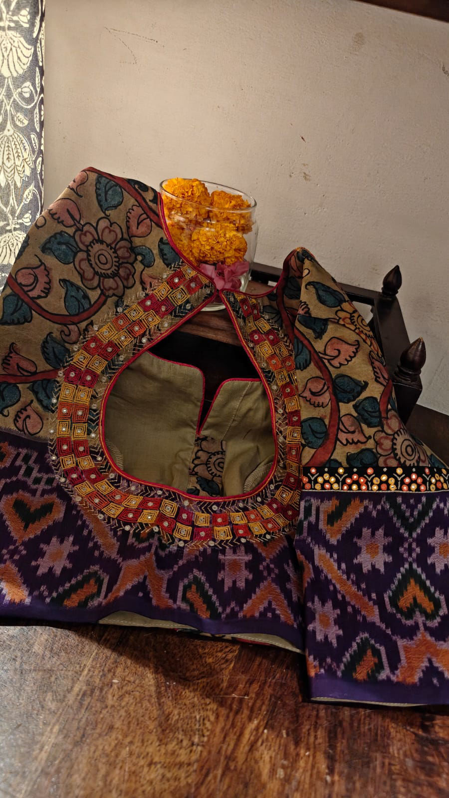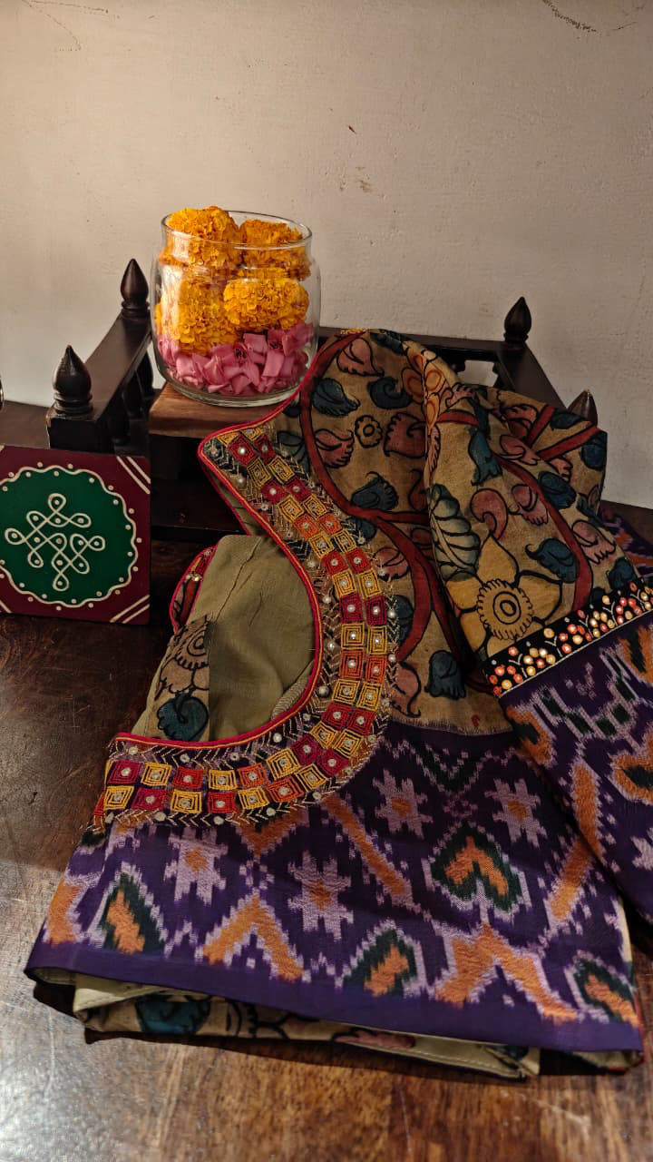 Pure ikkat silk — rich, rhythmic, and alive with movement. Layered with hand-drawn Kalamkari florals that feel like they’ve been gently painted into the weave. Across this canvas, colourful geometric embroidery adds structure and play — sharp lines meeting soft petals, symmetry dancing with freehand art.
