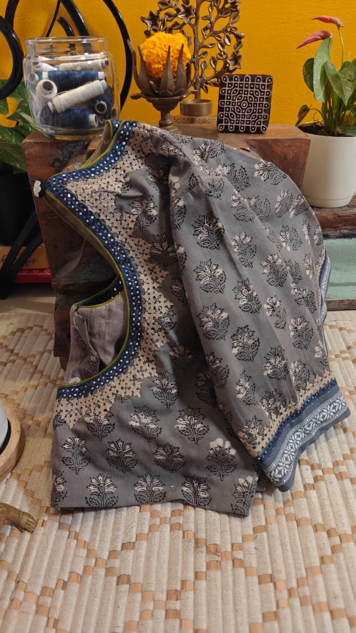 A soft grey cotton base, brought alive with delicate block printing — subtle, rhythmic, and rooted in tradition. The muted tone becomes the perfect canvas for serene ivory embroidery, each stitch carrying the spirit of handcrafted detail.