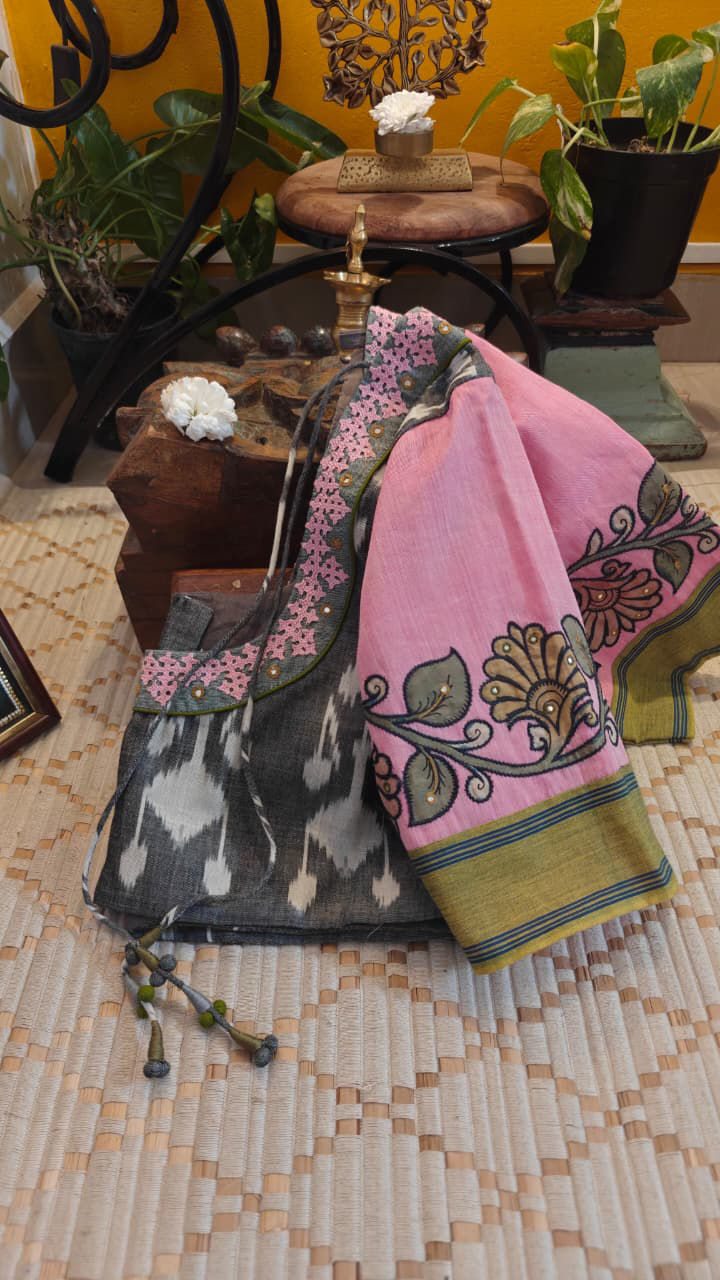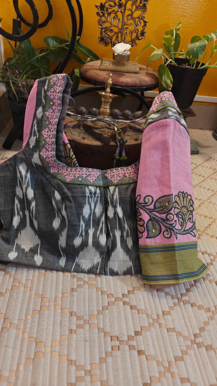 A soft grey ikkat brought to life with vibrant pink Kutchi embroidery, layered with thoughtfully appliquéd Kalamkari. The play of texture, colour, and craft creates a piece that feels rooted, lively, and full of character.