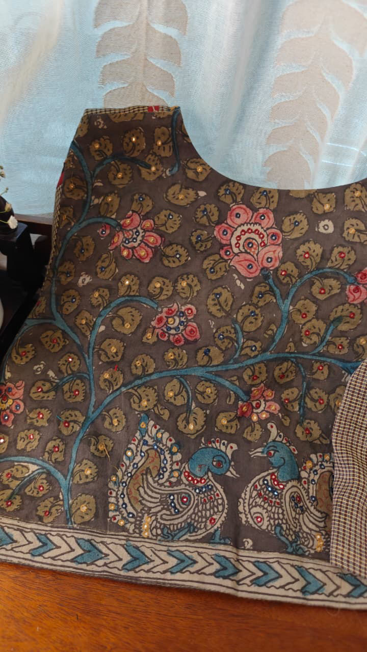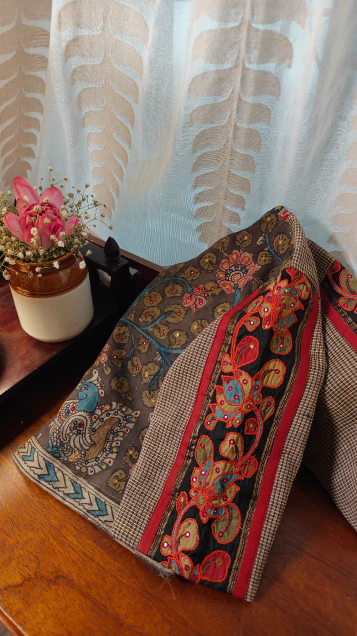 An unusual cotton Kalamkari set on a soft grey base, lifted with hues of pink and blue. Vertically appliquéd Kalamkari on the sleeves adds structure and quiet character. Thoughtful, distinctive, and crafted for everyday classics with a twist.