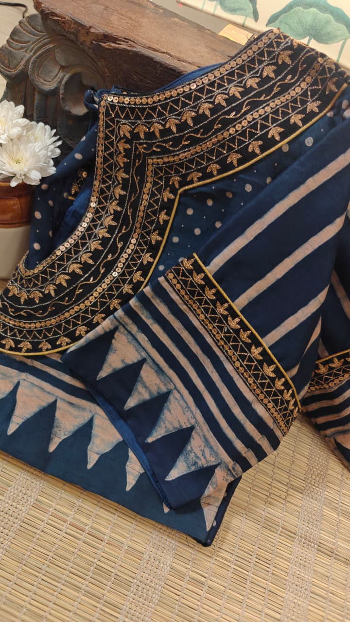 Indigo silk modal brought alive with classic block prints, finished with beaten gold embroidery that catches the light in just the right measure. A piece that feels rich, artistic, and quietly striking—where deep colour meets handcrafted detail with effortless beauty