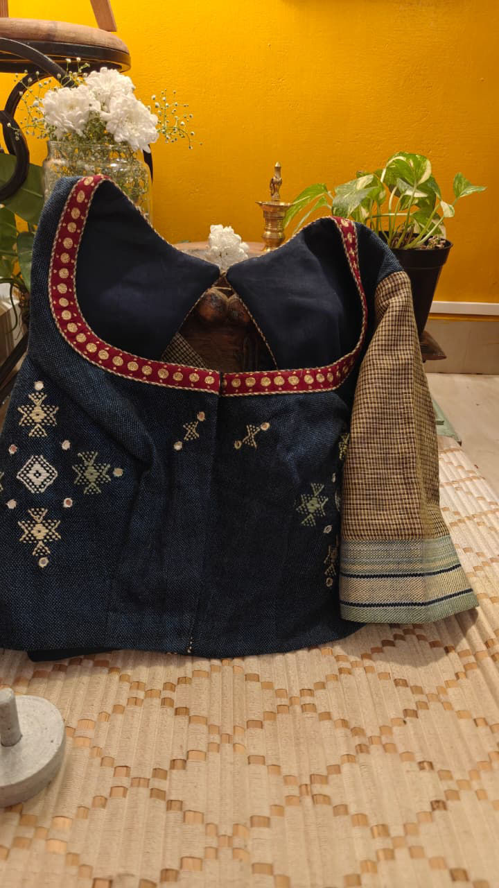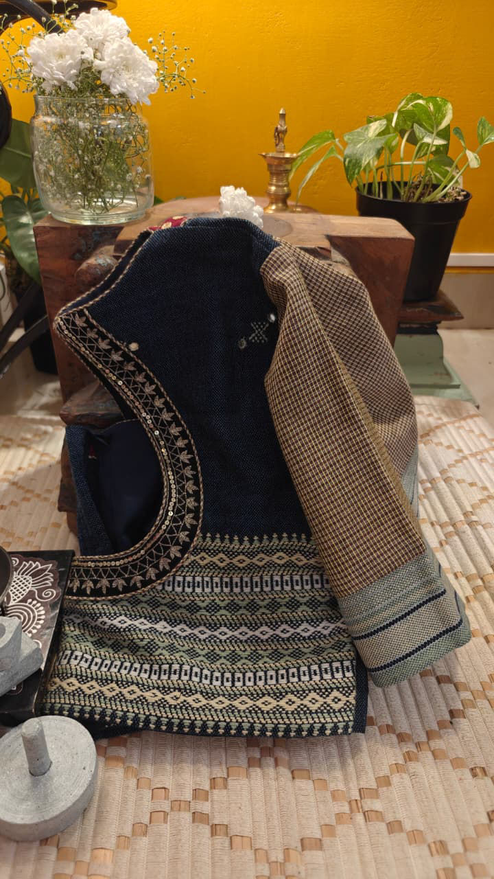 An intense blue Bhujodi weave, grounded and striking, detailed with subtle mirrors that add a quiet glint without overpowering the fabric. The classic cut keeps the focus on the weave itself — timeless, composed, and deeply rooted in handloom tradition.