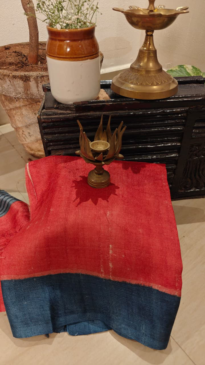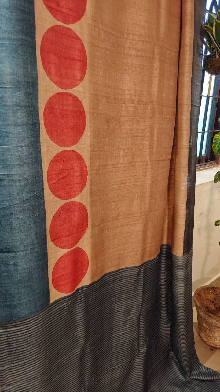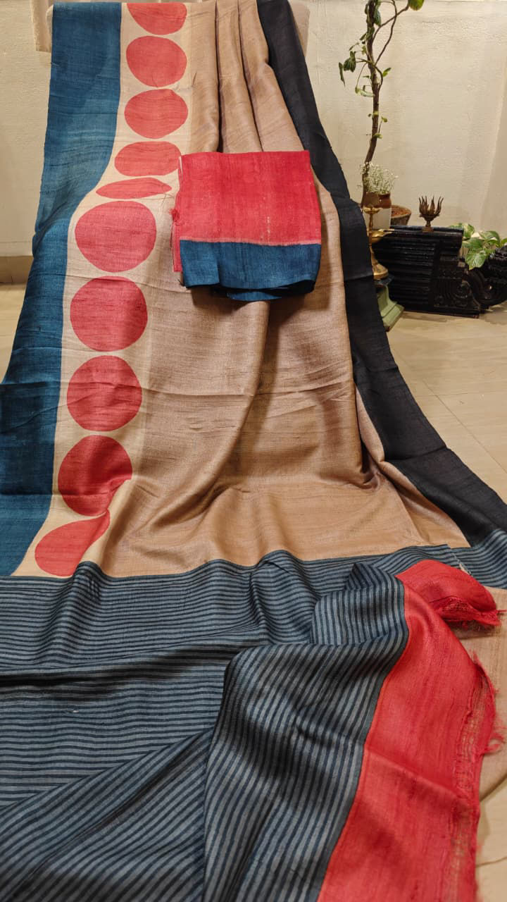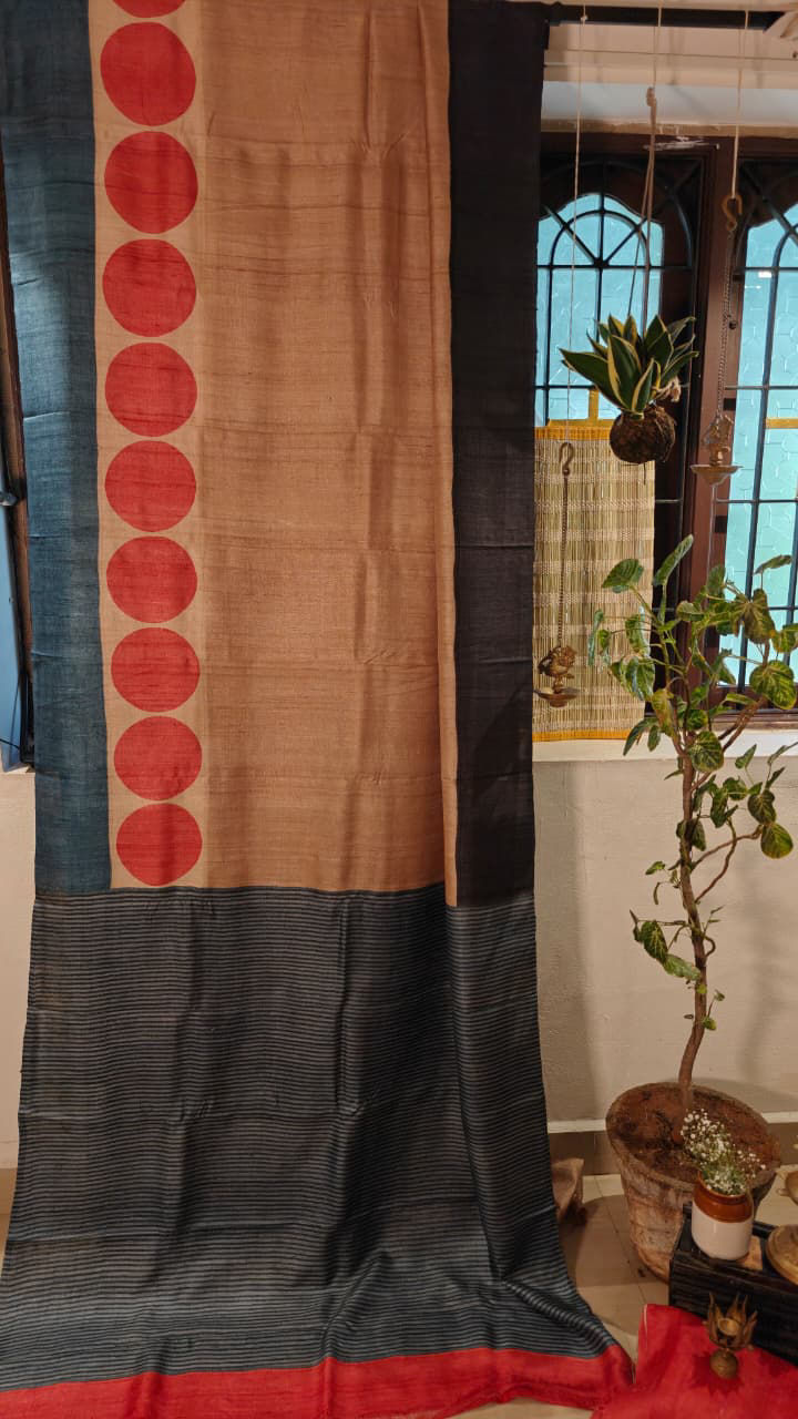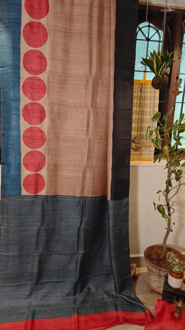A tussar saree in natural, earthy tones, framed with a deep indigo border and playful red polka dots that add just the right hint of contrast. The striped pallu brings structure and quiet sophistication, elevating the drape with timeless charm. Paired with a thoughtfully matched blouse, this is a classic that speaks through restraint and detail. ✨ Handmade | Rooted | Endlessly wearable
