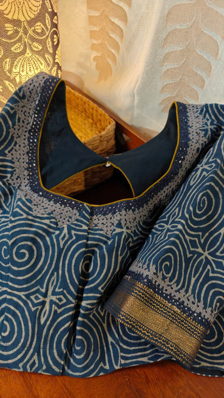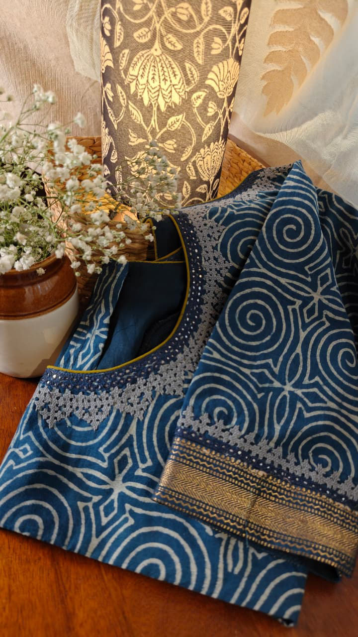 Deep indigo meets the quiet beauty of Kutchi embroidery, hand-done in a soft pale blue. Rooted in folk traditions, every stitch carries the warmth of craft and the rhythm of the artisan’s hand. Timeless, soulful, and unmistakably handcrafted — a piece that speaks without trying too hard. Svasa exclusive.