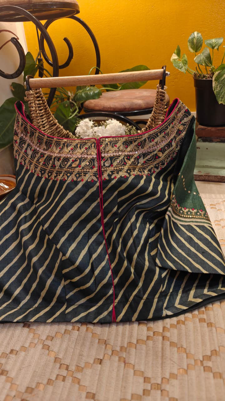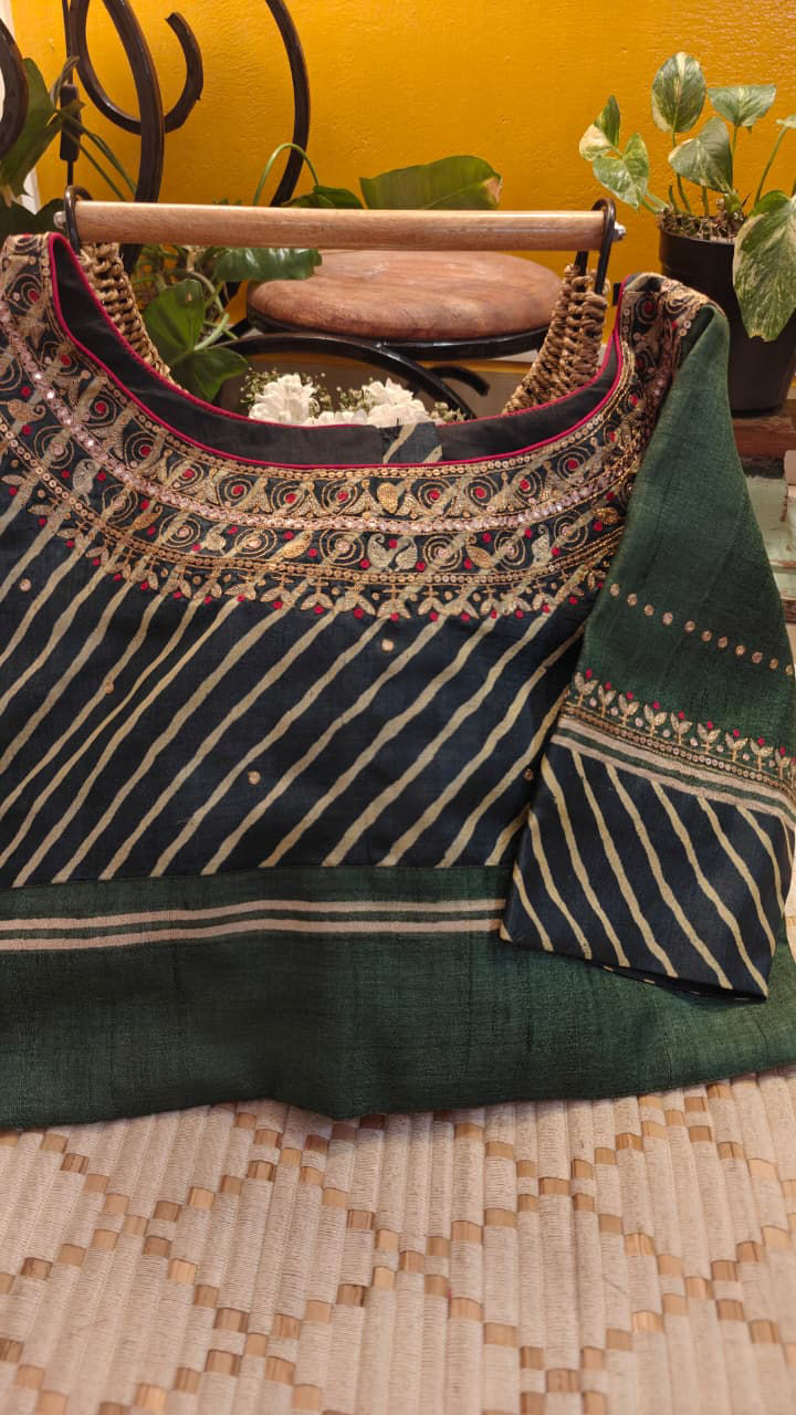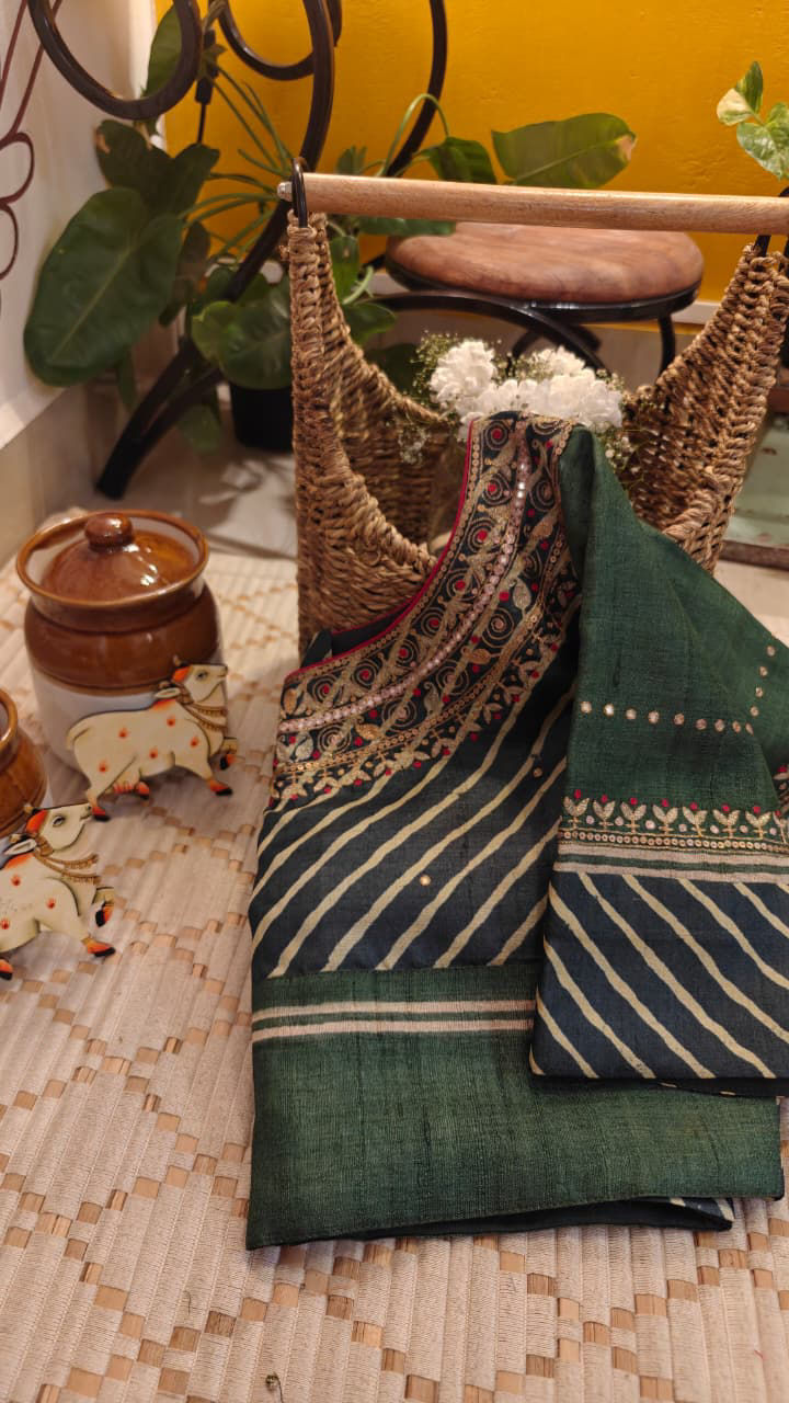 Indigo and green come alive in fluid leheriya on pure tussar silk. Beaten gold paisleys add a quiet richness, while gentle dots of colour bring rhythm and lift. A piece that balances movement and craft — rooted, luminous, and timeless.