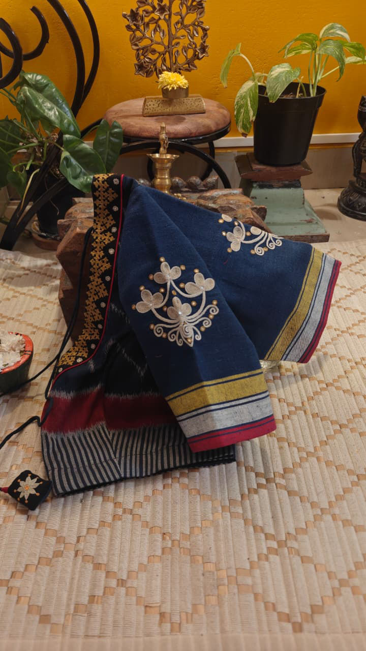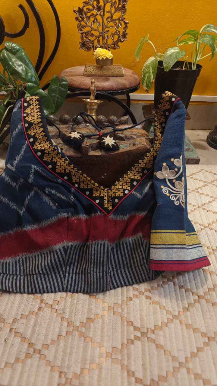 Deep indigo ikkat forms the base—layered with thick Kutchi embroidery in earthy ochre that stands out with quiet strength. The interplay of weave and handwork brings a grounded, rustic character, where every thread feels intentional, bold, and deeply rooted in craft.