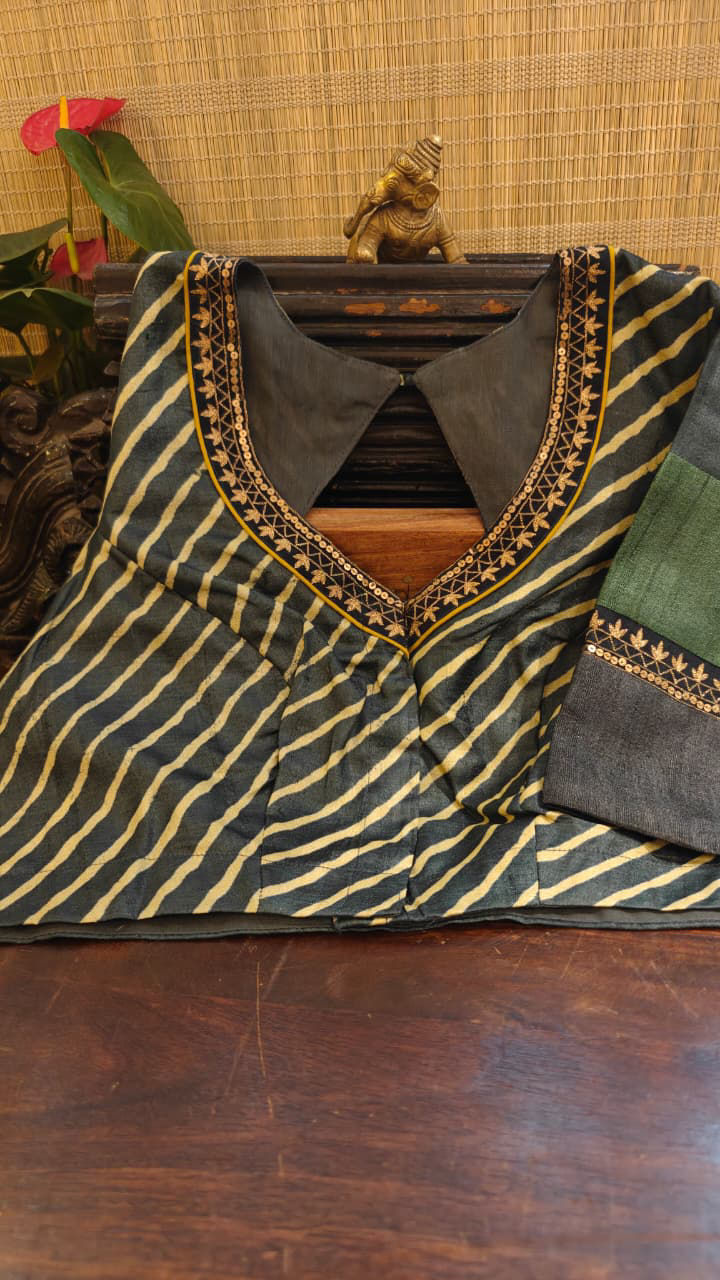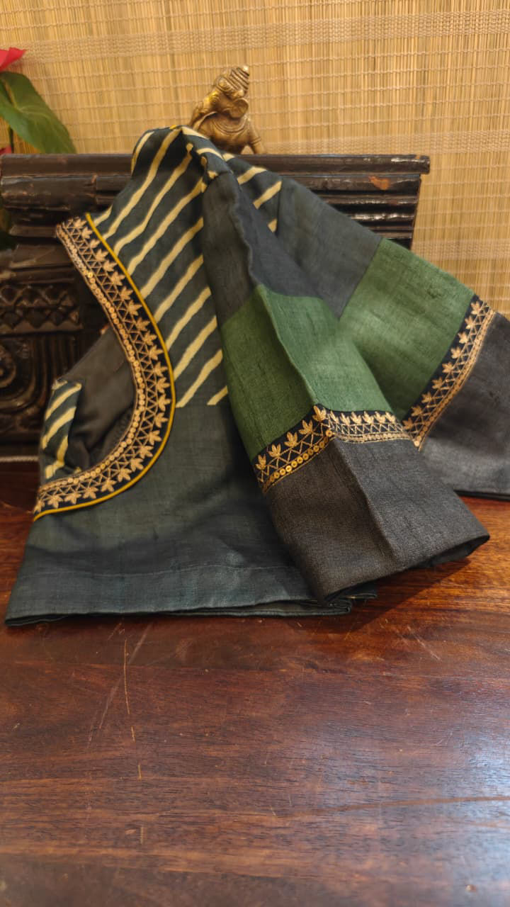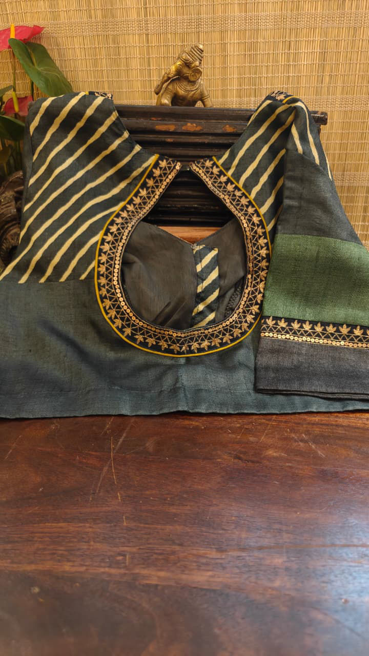 A beautiful tussar in deep indigo, layered with the fluid rhythm of leheriya that moves like a quiet story across the weave. There’s a certain depth here—rich, grounded, and effortlessly striking. Accented with vintage embroidery in antique gold, the piece carries an old-world charm, where every detail feels considered and timeless, coming together in a way that is both classic and distinctive.