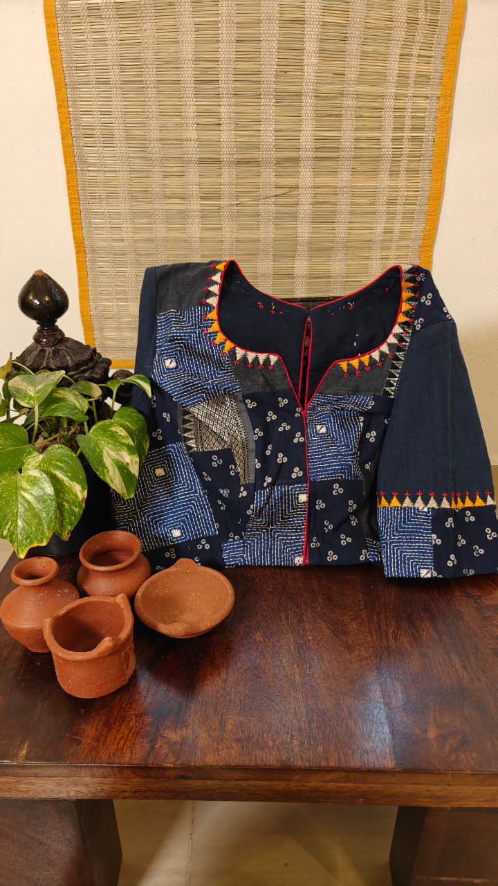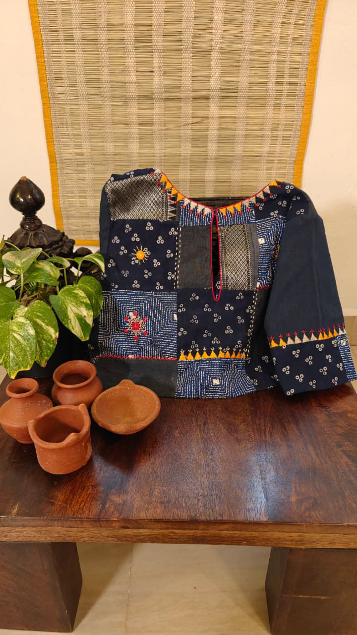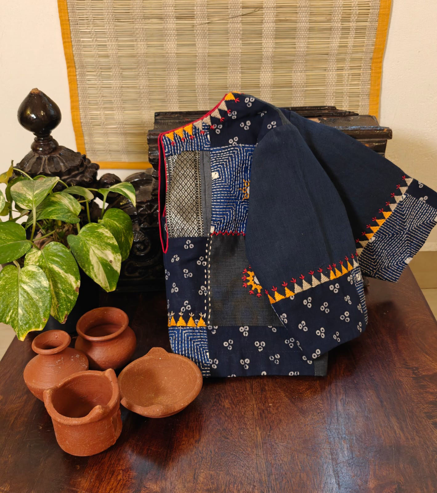 Patches of indigo sewn together, each carrying a story from another weave. Recycled. Thoughtfully crafted. Finished with abstract embroidery that ties it all into one beautifully sustainable piece.