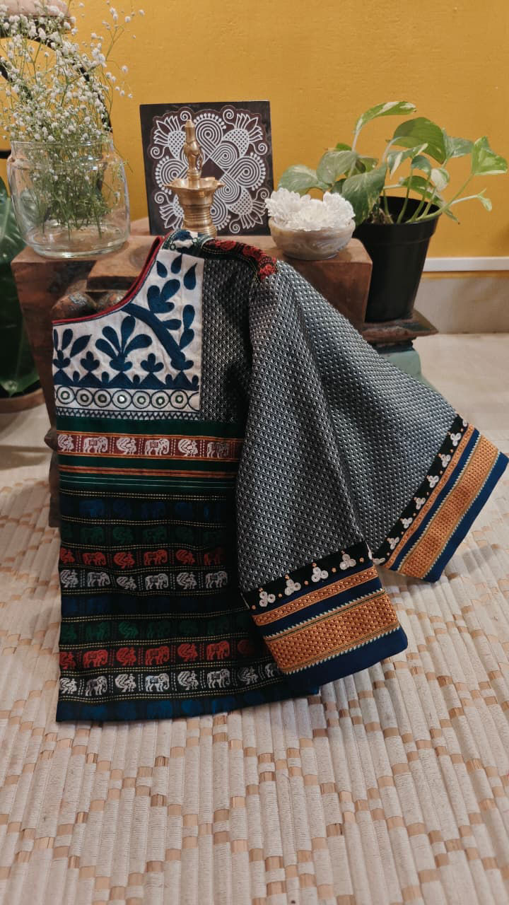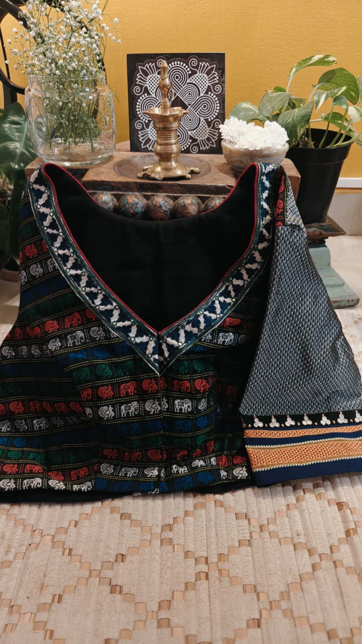 Our artisans creatively hand embroider, hand paint and hand print the blouses that come to you from the design house of SVASA. We use hand woven fabric extensively. You may notice very minute, almost insignificant flaws in the crafts since they are all handmade. We urge our patrons to overlook a few human errors that may have occurred in the process. Our aspirations are towards an empowered society, focusing on keeping traditional needlecraft alive for a long time to come.