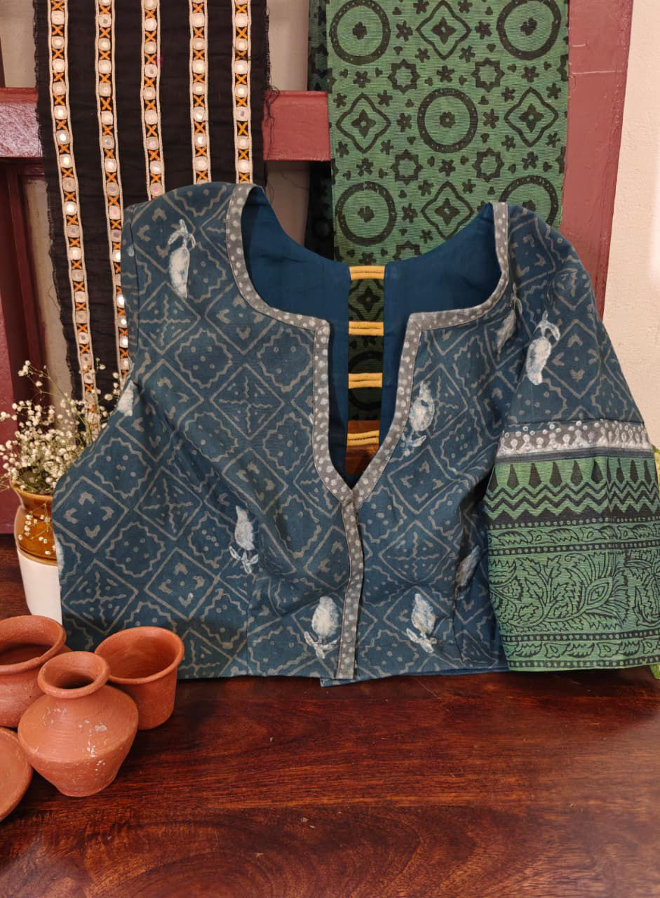 Hand-printed Indigo cotton handloom becomes the canvas for sincere craft. A rich jade green border frames the neck, hem, and sleeves, while Kutchi embroidered borders form the highlights..