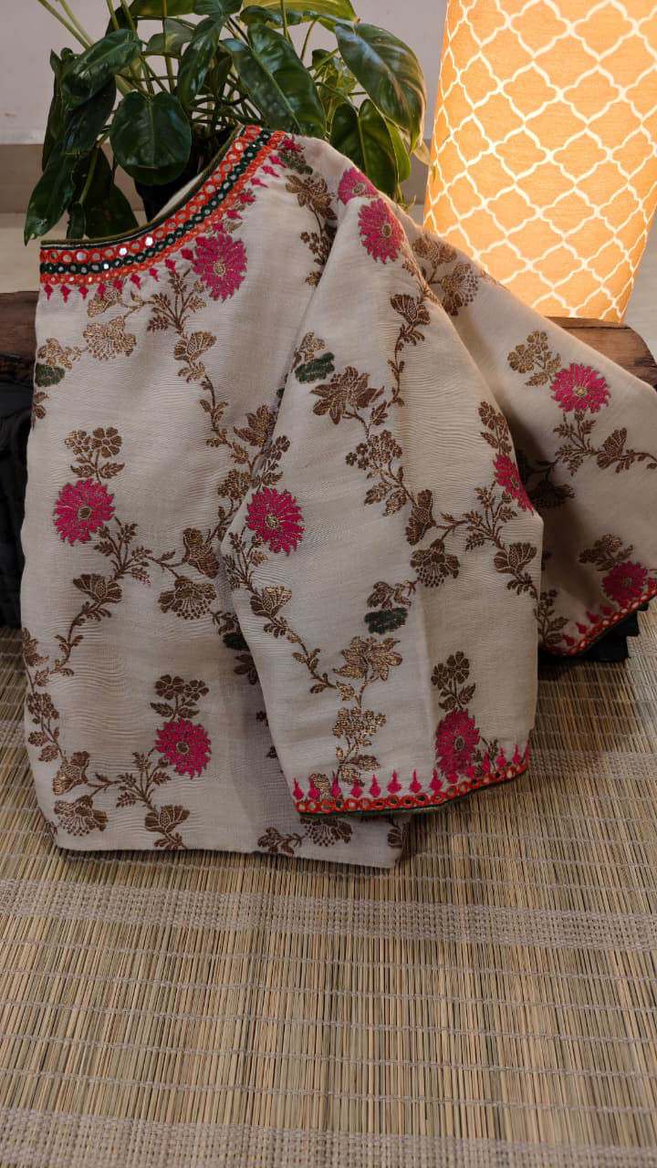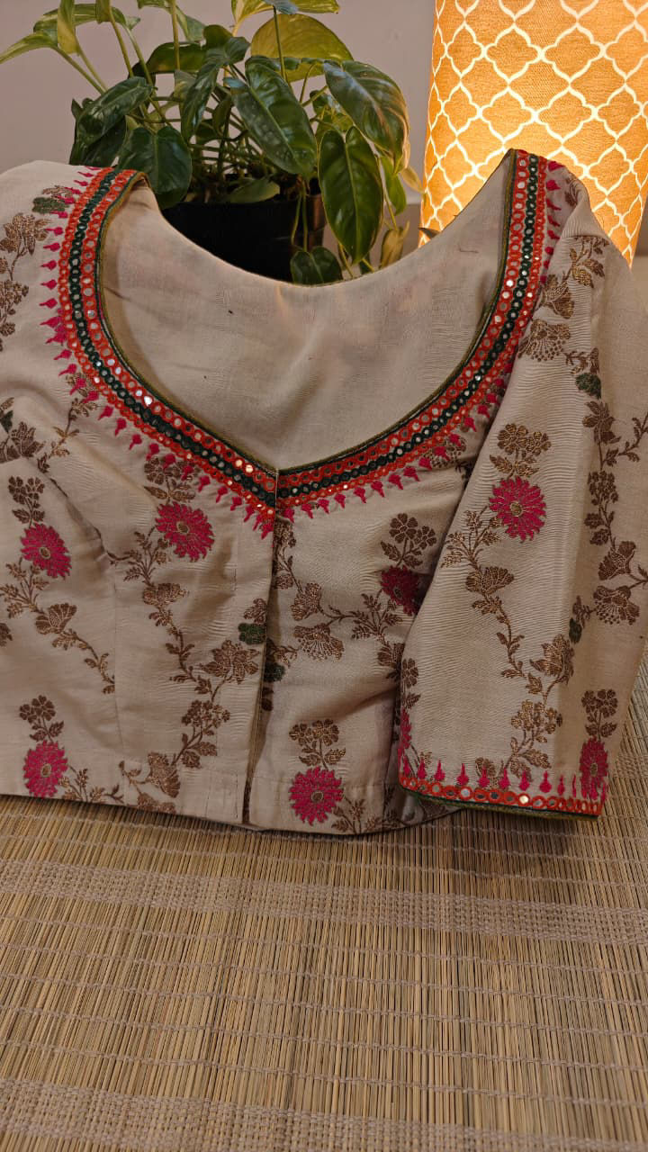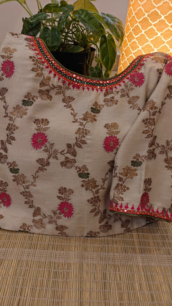 A classic ivory Muga silk blouseโ€”elegant and timeless. Woven with delicate pink and green tendrils, each highlighted in soft gold, this piece is a quiet celebration of craft. A blouse that pairs beautifully with heritage sarees or adds charm to any festive drape. Pure, poetic, and uniquely Svasa.