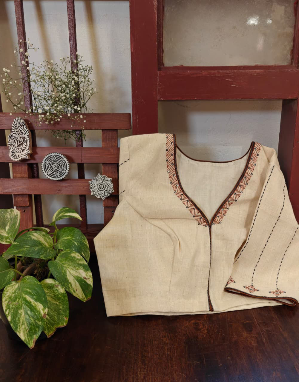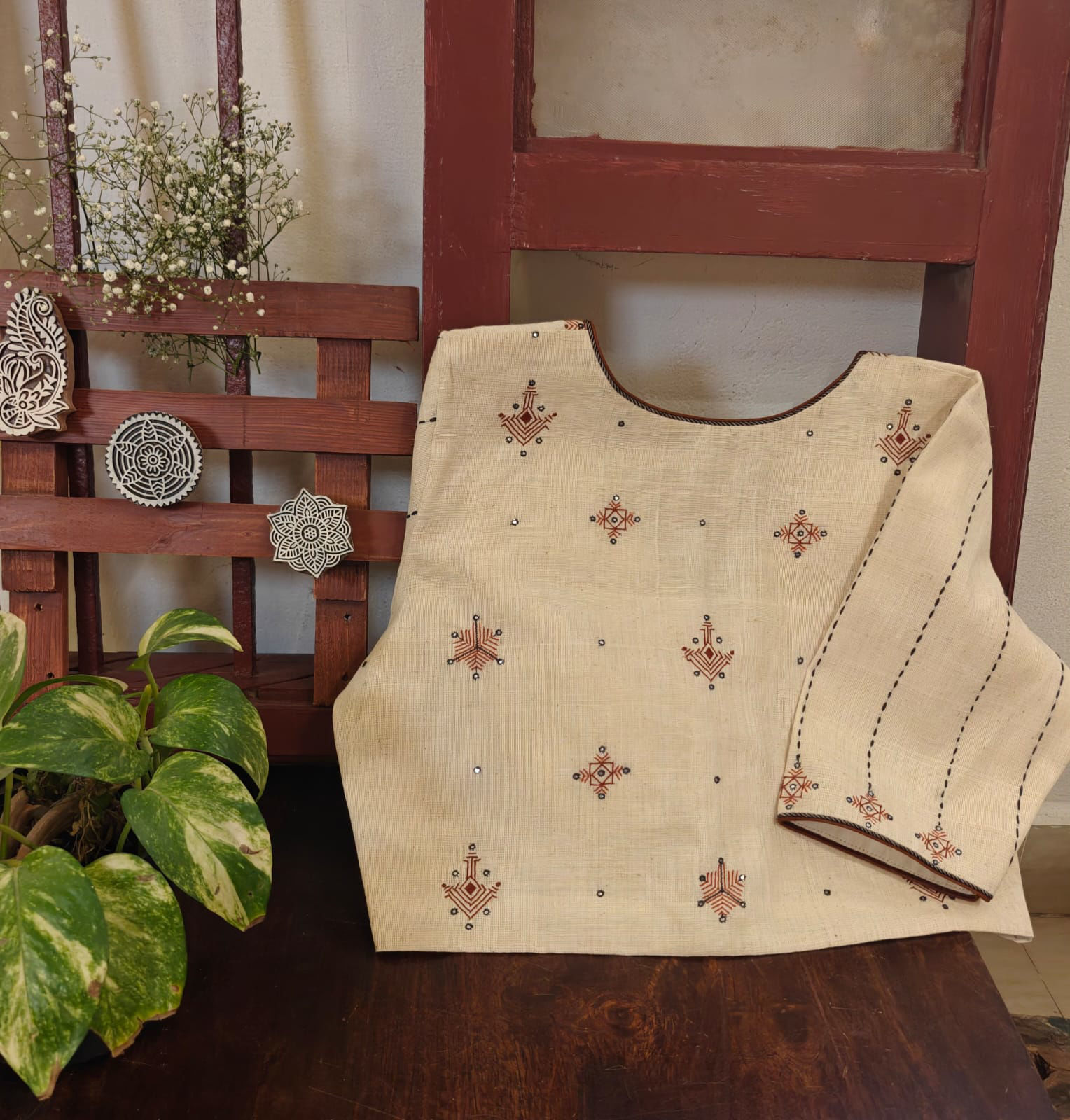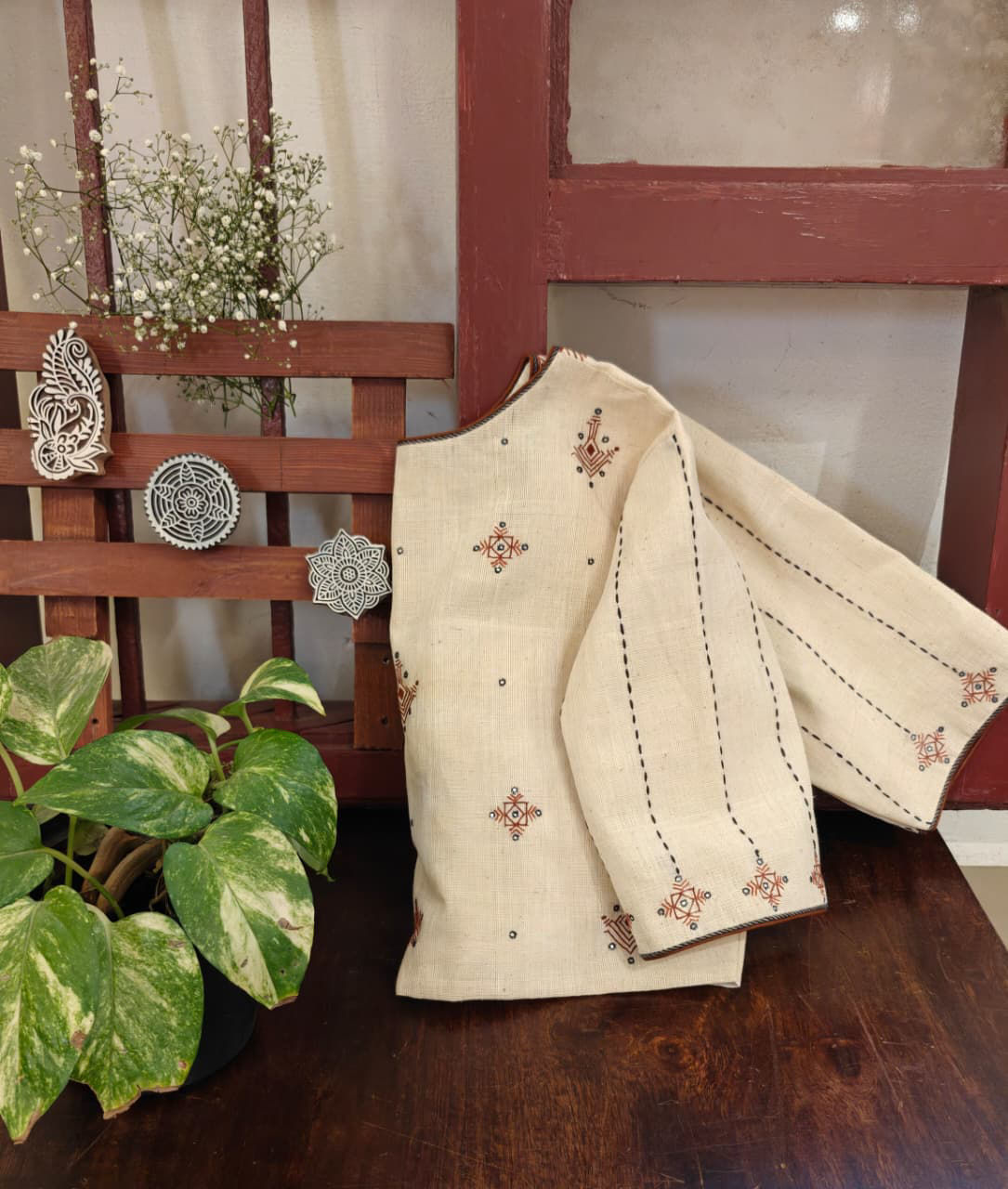Pure ivory kora becomes a canvas for abstract motifs in warm shades of rust, brought alive with tactile tack stitches. Subtle yet striking, raw yet refined — every detail holds intention. An original creation from Svasa, shaped slowly, staying true to craft.