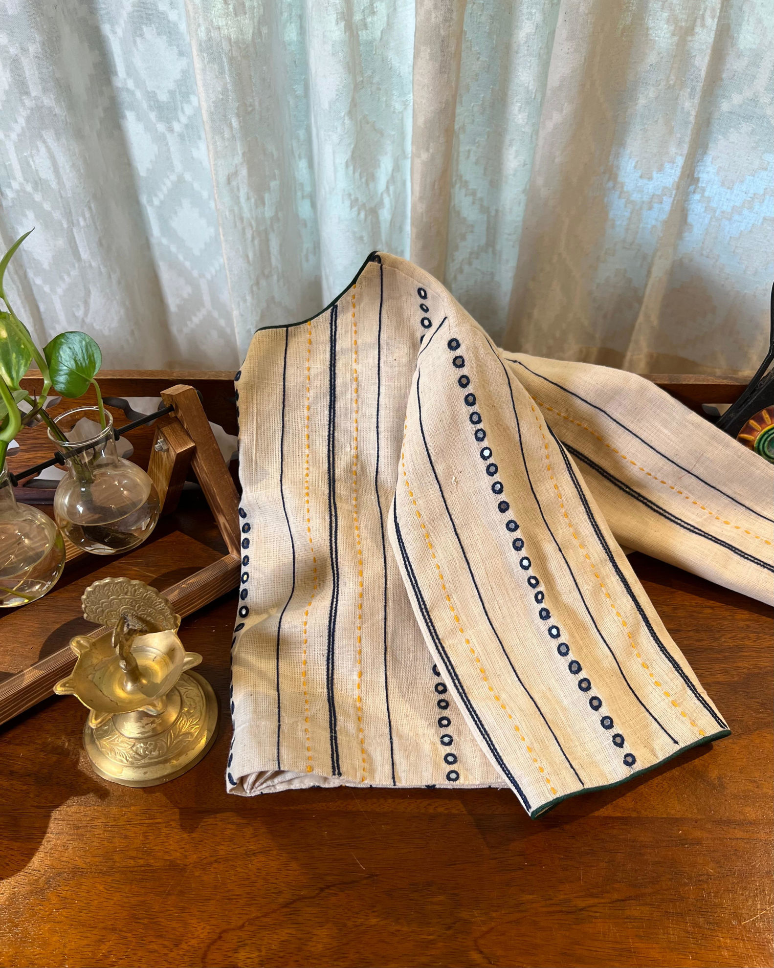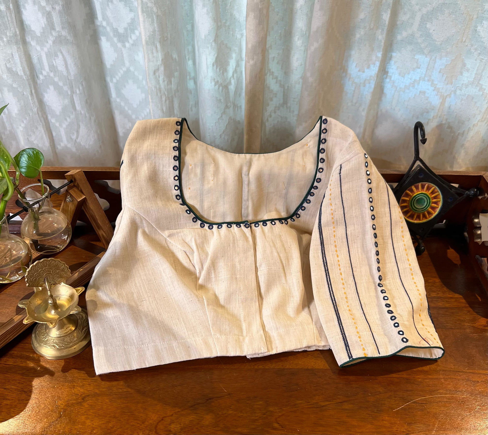 A classic Kora in soft ivory—light as a whisper, timeless as ever. Indigo mirrors catch the light while tiny tacks in turmeric hues add a subtle glow. Simple, soulful, and stitched for those who see beauty in the quiet details. Blouse. Cotton. Woven stories by Svasa.