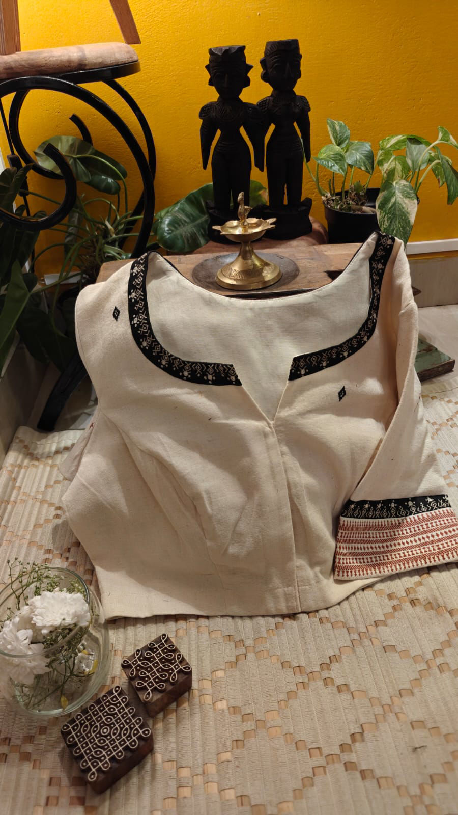 Ivory kora cotton brought alive with a hand-drawn kolam motif, rooted in quiet symbolism and everyday ritual. Framed with Bhujodi borders, the piece carries a gentle rhythm of craft—earthy, grounded, and deeply familiar. An understated cotton creation where tradition sits effortlessly within simplicity, meant for those who find beauty in calm, lived-in textures.