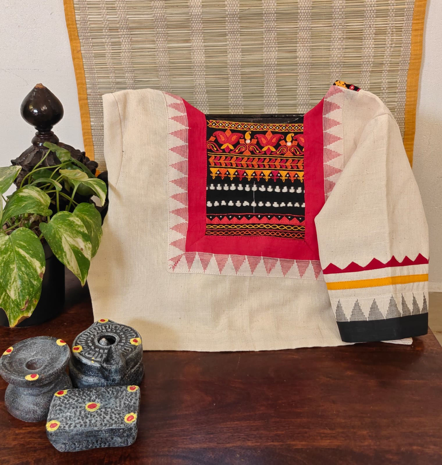 An Ivory & Red Ponduru base fused with an iconic red body — rustic in feel, honest in fibre. Tribal borders are embroidered by hand around the yoke, each stitch hand-hemmed to celebrate craft over perfection. .