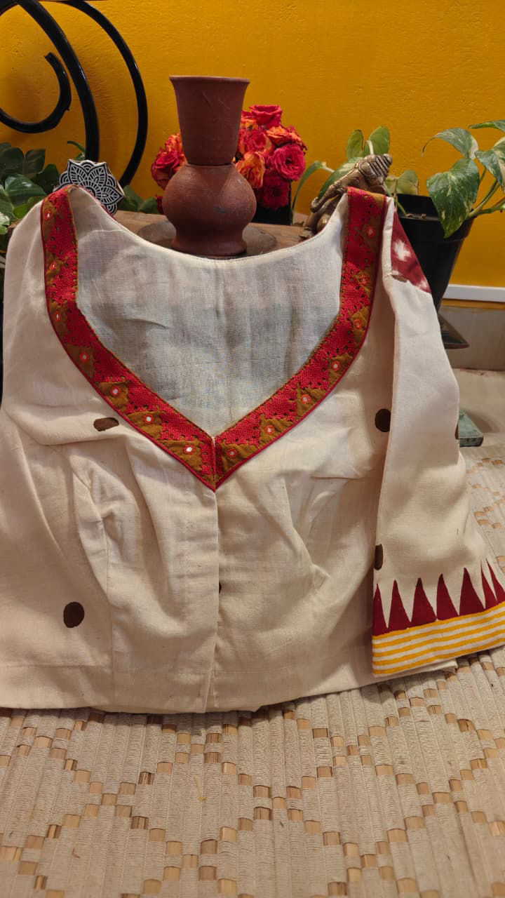 Our artisans creatively hand embroider, hand paint and hand print the blouses that come to you from the design house of SVASA. We use hand woven fabric extensively. You may notice very minute, almost insignificant flaws in the crafts since they are all handmade. We urge our patrons to overlook a few human errors that may have occurred in the process. Our aspirations are towards an empowered society, focusing on keeping traditional needlecraft alive for a long time to come.