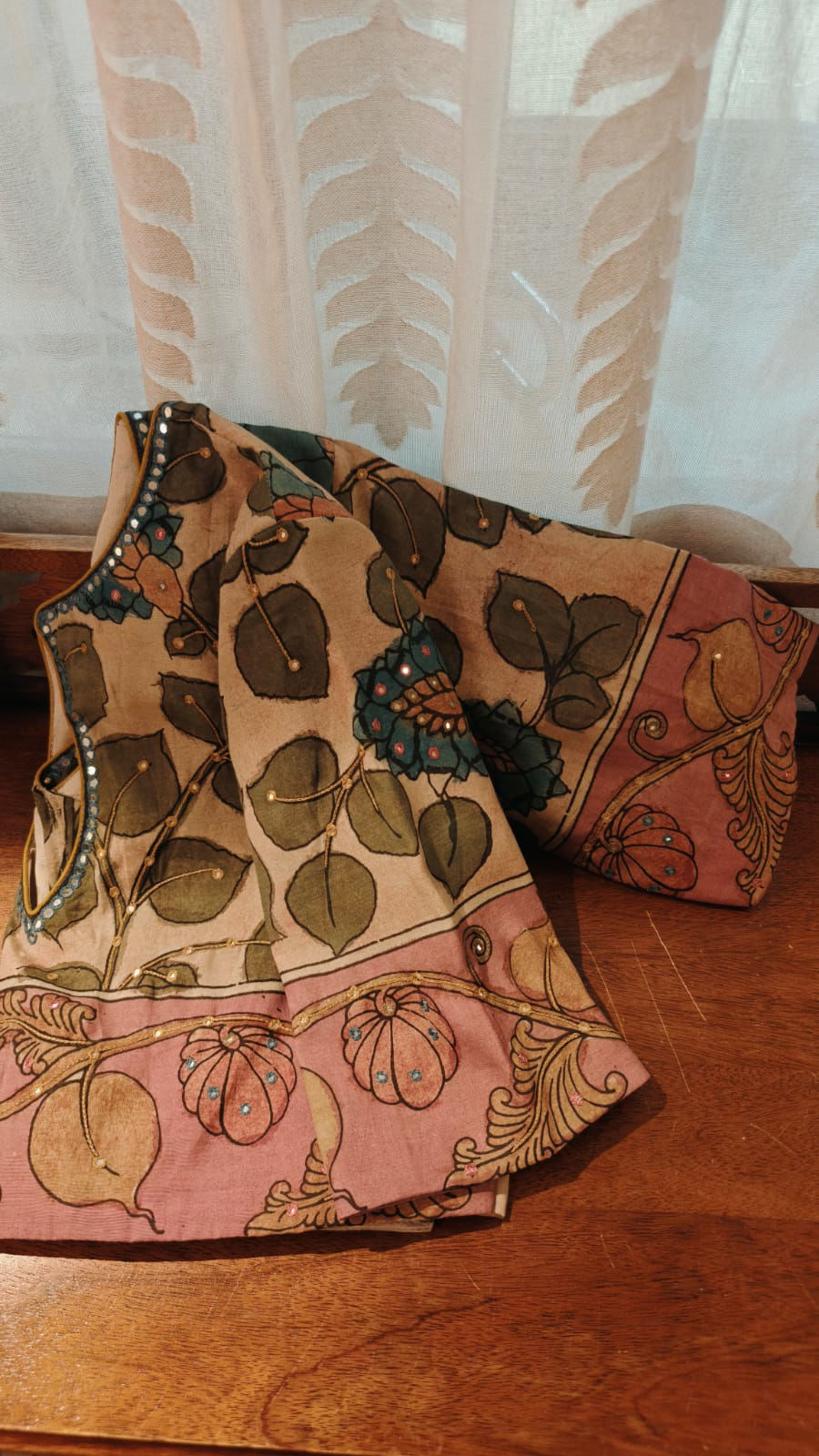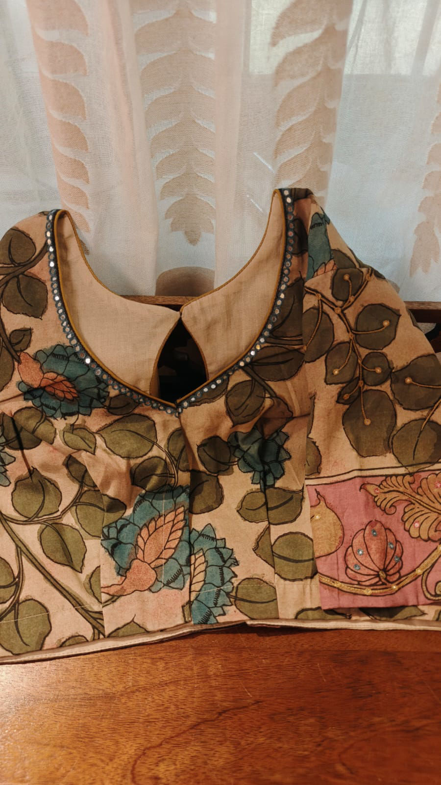 Handcrafted Kalamkari silk comes alive with delicate floral expressions, gently studded with mirrors that catch light with every movement. Rooted in tradition yet touched with playfulness, the blouse celebrates the beauty of hand-drawn artistry enhanced by subtle shimmer.