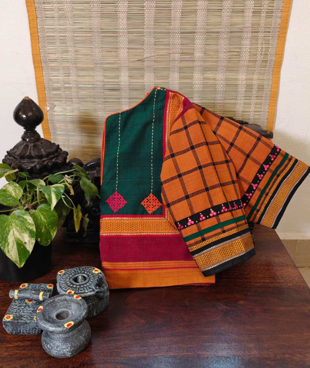 🧵 Kandangi checks in fiery red meeting soulful green rails ✨ Hand-stitched Kutch motifs blooming on textured cotton 🌿 Sustainable • Handmade • Limited weave story 🪡 Slow-crafted patterns, sewn to travel across traditions