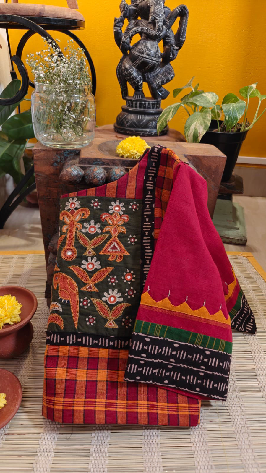 Classic Kandangi checks unfold on a rich moss green cotton base, grounded and earthy in tone. A bold tribal yoke anchors the design, adding character and depth with its raw, handcrafted presence.