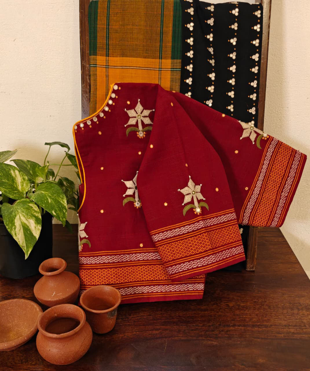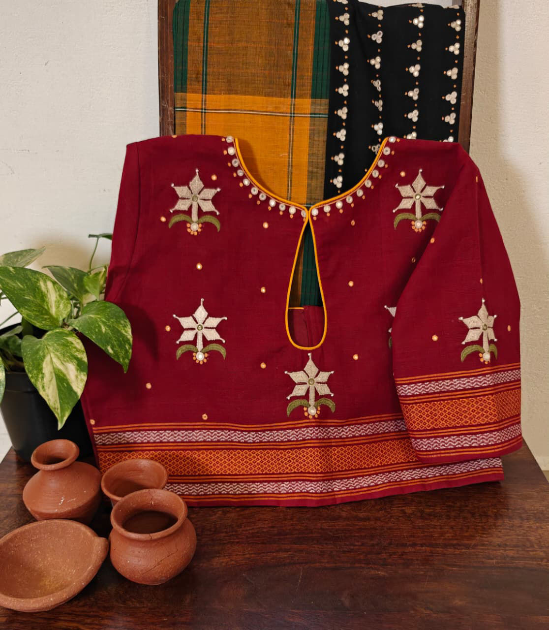 Our artisans creatively hand embroider, hand paint and hand print the blouses that come to you from the design house of SVASA. We use hand woven fabric extensively. You may notice very minute, almost insignificant flaws in the crafts since they are all handmade. We urge our patrons to overlook a few human errors that may have occurred in the process. Our aspirations are towards an empowered society, focusing on keeping traditional needlecraft alive for a long time to come.