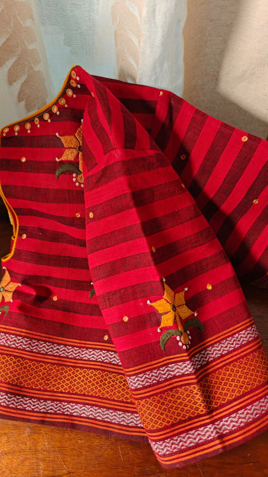 Bold red and deep red Kandangi stripes come alive with tribal motifs, lit gently by shades of yellow. Rooted patterns, raw lines, and a colour story that feels both festive and grounded. Crafted in cotton, this piece carries the strength of tradition with everyday ease.