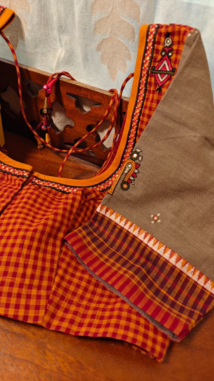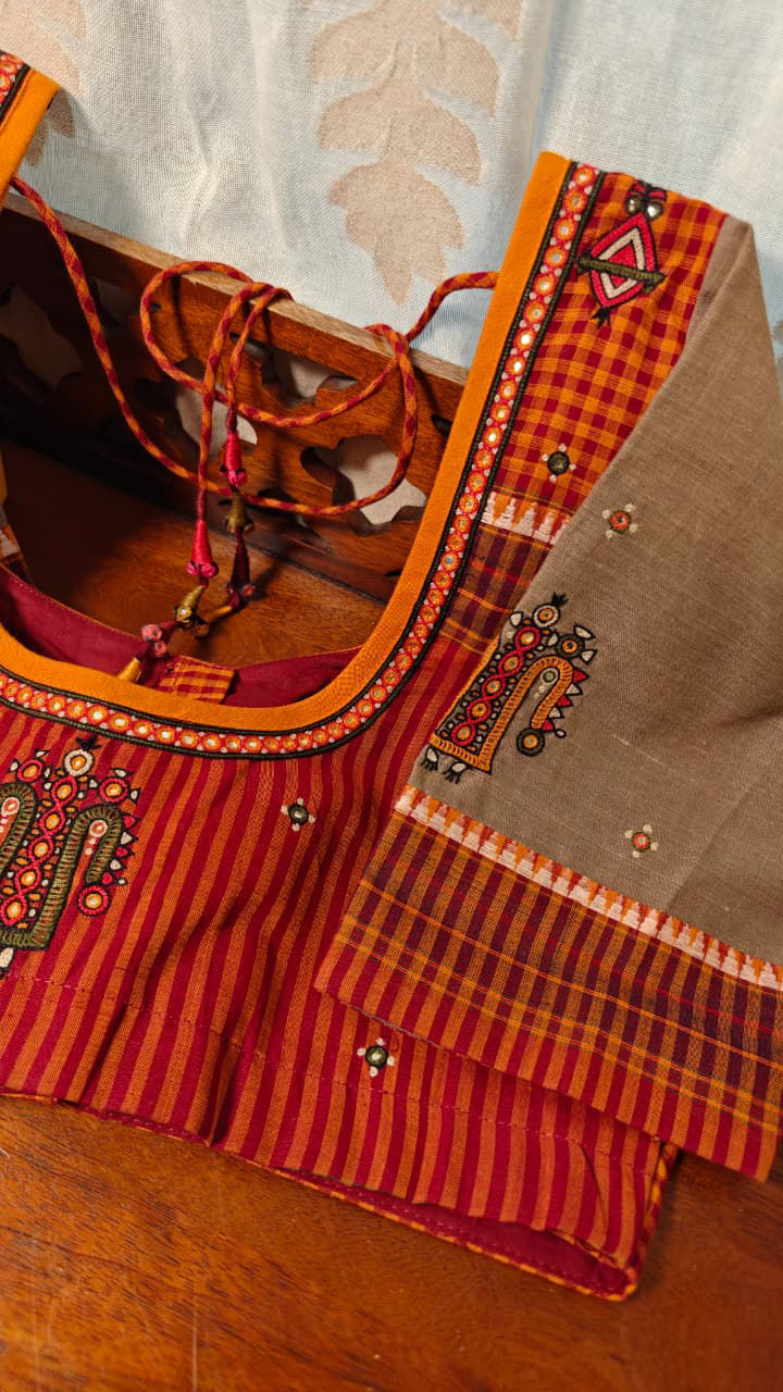 Our artisans creatively hand embroider, hand paint and hand print the blouses that come to you from the design house of SVASA. We use hand woven fabric extensively. You may notice very minute, almost insignificant flaws in the crafts since they are all handmade. We urge our patrons to overlook a few human errors that may have occurred in the process. Our aspirations are towards an empowered society, focusing on keeping traditional needlecraft alive for a long time to come.