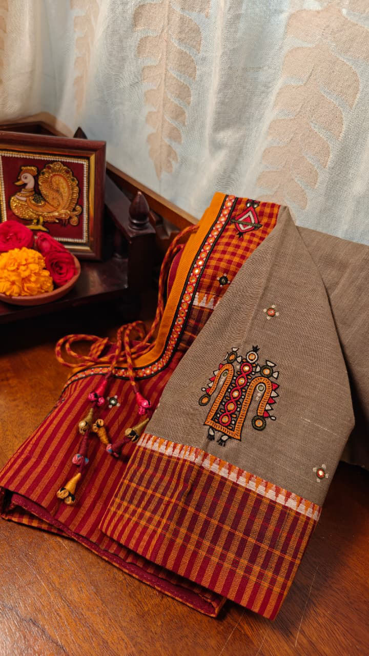 Another Kandangi revival, woven in tiny checks with a soft dash of grey, drawn from vintage motifs in our archives. Rooted, restrained, and thoughtfully brought back — a quiet tribute to enduring handloom traditions.